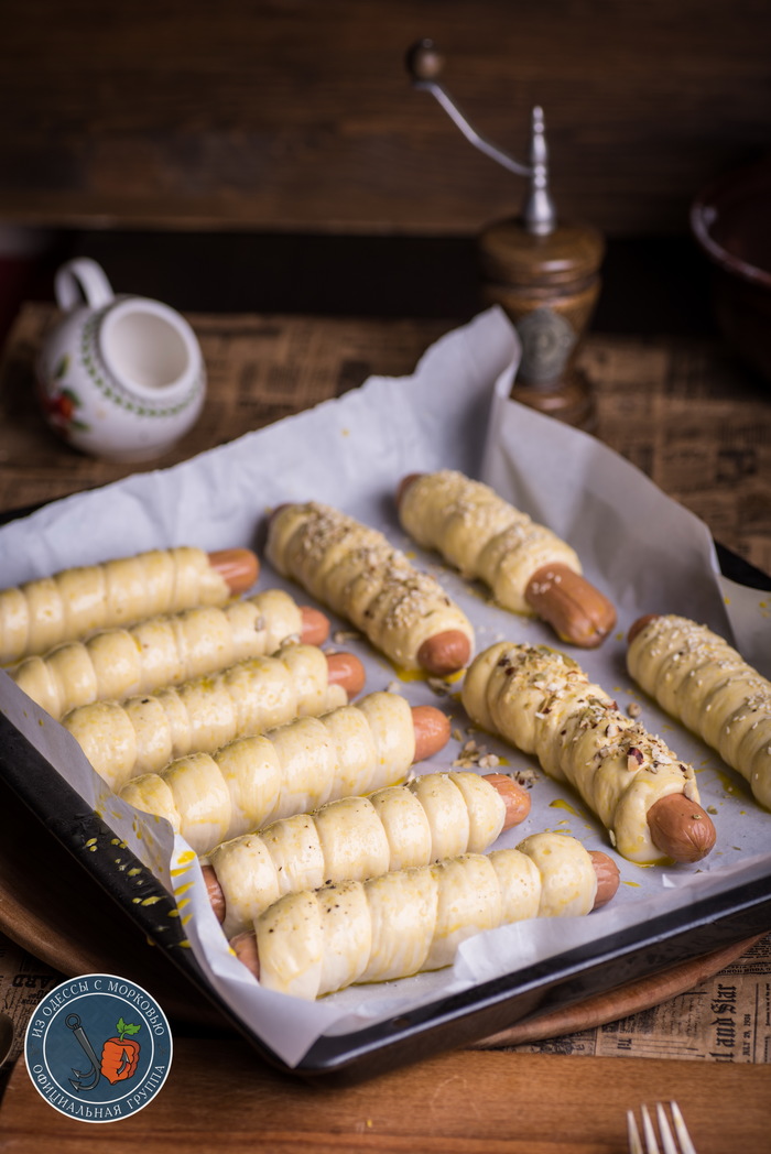 - Яйцо смешать с 1-2 ч.л. воды и смазать все сосиски. Для разнообразия я часть посыпал колотыми орехами и семечками, часть- кунжутом, а остальные оставил, как есть.