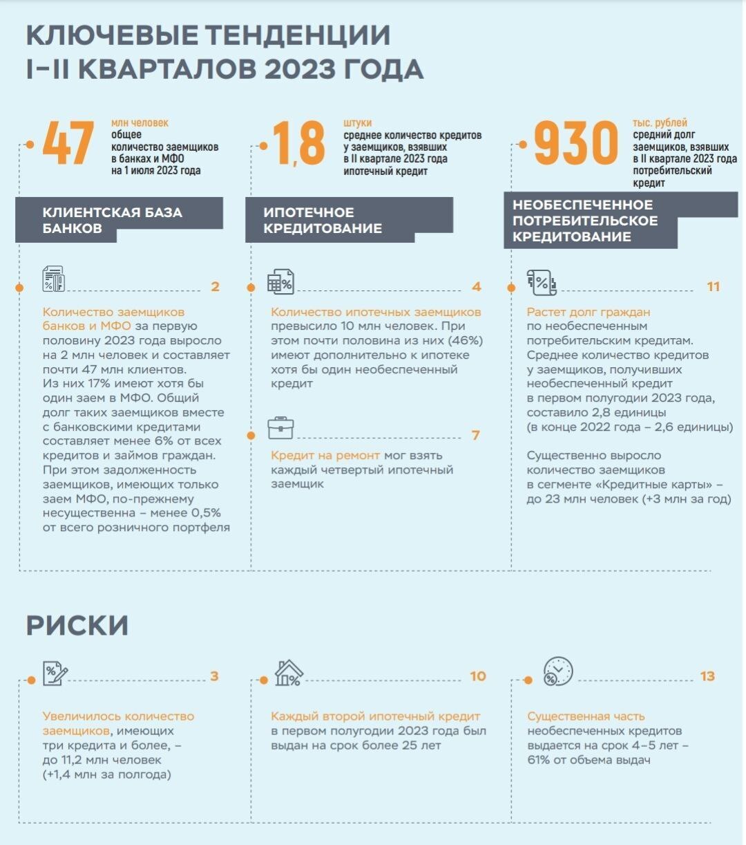 Бонус — это борьба Банка России с закредитованностью населения. Данные за первые полгода не радуют. Хотя бы один кредит есть у 47 миллионов граждан России (+2 миллиона с начала года), а ипотека есть уже у 10 миллионов человек. Все это показывает, что населению не хватает денег на жизнь и им приходится искать, где перехватить рубли до зарплаты. На это также указывает рост открытия кредитных карт — плюс три миллиона (всего есть у 23 миллионов). Доклад регулятора полностью можно посмотреть здесь, а ниже пара основных слайдов.