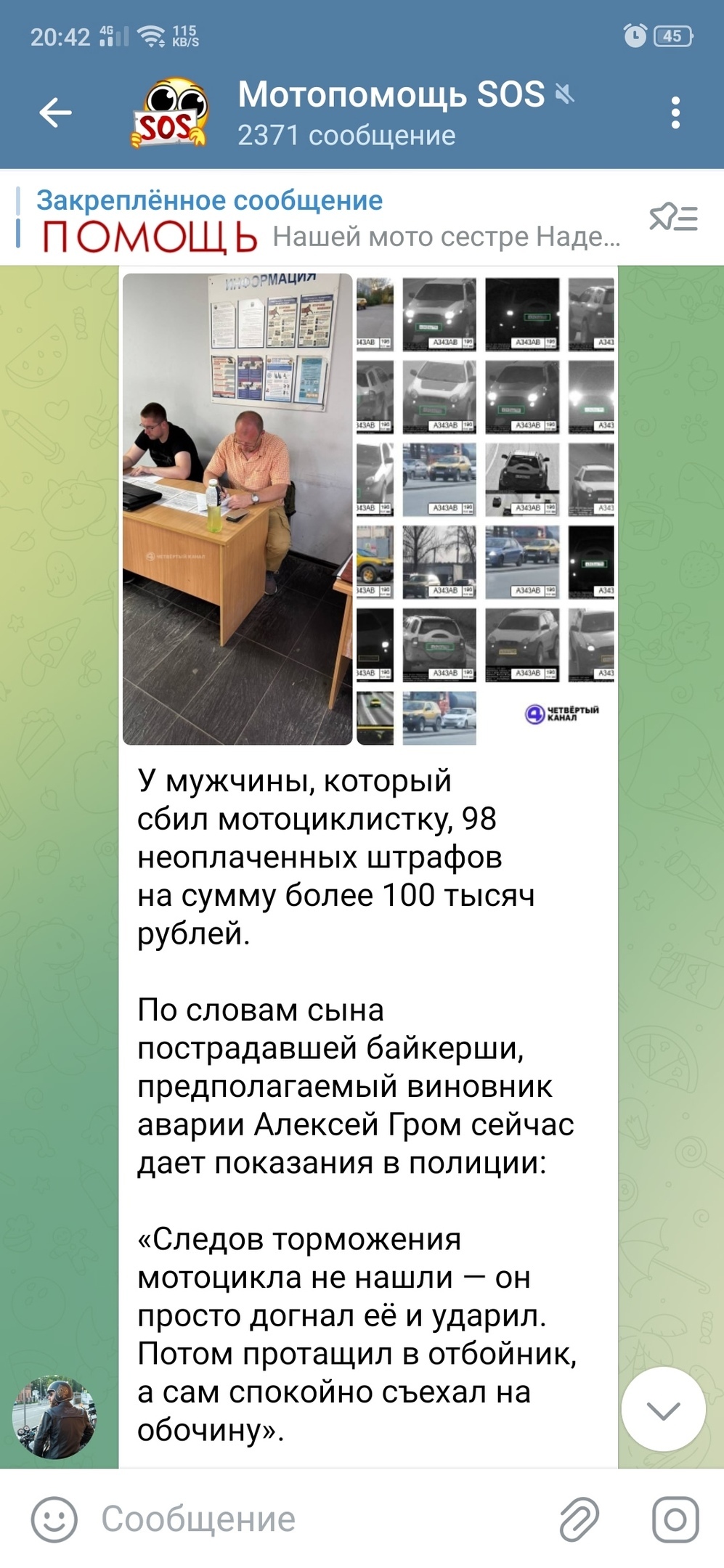 «В первом случае человек не получил травм, поэтому это ДТП оформили как обычное происшествие. Казалось бы, на этом всё должно было закончиться. Но спустя условных две недели происходит ДТП с Надеждой, она получила тяжелые травмы. И все выглядит так, словно водитель автомобиля преднамеренно наехал на мотоцикл и какое-то время еще его протащил по дороге. Поэтому я пришел, чтобы вызвать общественный резонанс и объяснить всем, что не согласен с проведением данного персонажа, но, опять же, в рамках закона. Понятно, что никто не будет пытаться нанести ему увечья», — высказался байкер.