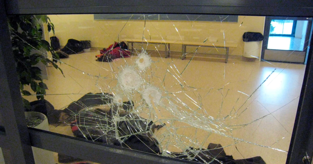 Так он оказался у запертой учительской. Попытки выбить дверь успехом не увенчались и тогда псих принялся орать "Выходите! Я убью вас". Как можно догадаться, подобные заявления негативно влияют на мотивацию людей. Пекке никто не открыл. А вот соседний класс оказался вообще не заперт. Парень зашел туда и принялся командовать учениками, провозглашая революцию и призывая учеников громить школу. После Аувинен застрелил стоявший в кабинете телевизор, прострелил окно и выбежал прочь.