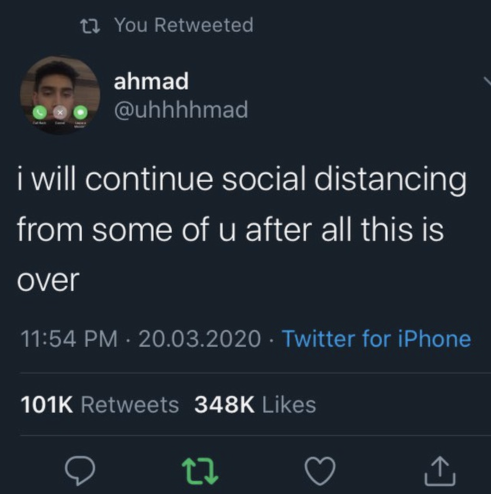 11 ngj68735 Юмор Социальное Дистанцирование 5 лет назад прим. перевод.: "Я продолжу держаться от некоторых из вас подальше после того как закончится всё это" Карантин X (Twitter) Пандемия Коронавирус Юмор Картинка с текстом Социальная дистанция Ещё 0