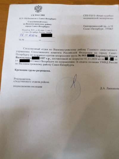 8. Едете в ГУП "Ритуальные услуги" (в СПБ: 1 Советская, д. 8). Важно, чтобы это было именно государственное предприятие, много частных похоронных контор пытаются в интернете притворяться ими. Очередь живая (я был первым в этот день). На входе охрана просит предъявить паспорт. Отдаёте: гербовое свидетельство о смерти, справку Ф-11, справку из ПФР (со СНИЛС!). Говорите, что хотите социальные похороны. В этом случае ГУП забирает себе пособие на погребение и за счёт этого пособия организует оплату перевозки тела от места смерти до морга, гроб, урну и кремацию. Есть также вариант захоронения в гробу на том кладбище, куда определит диспетчер (на тот момент было Южное кладбище на Волхонке). Гроб простой, но вполне достойный, оббитый черной тканью. Подойдет, если вы не фанат темы "дорохобохато" с лакированным красным деревом и прочими бронзовыми ручками. Предлагают на выбор прощание либо в морге, либо в крематории. Я выбрал малый зал крематория. В малых залах крематория постамент гроба не механизирован, после того, как все выйдут из зала, гроб с постамента скидывают руками. В среднем и большом залах по окончании прощания гроб с телом технично уезжает (опускается) в подвал. Как элемент шоу, наверное, круто, но стоимость этих залов в разы дороже. Дату и время прощания назначает диспетчер. По времени оформление заняло 45 минут. Квитанции об оплате выдают.
