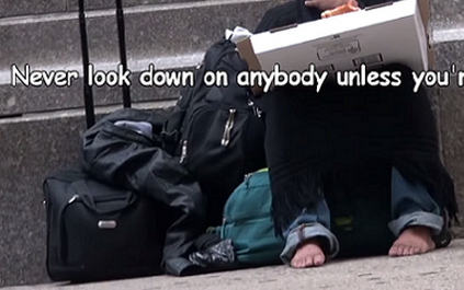 Тебе еще раз сказать или бесполезно, до тебя не допрет? Люди разные бывают. Существует очень много людей, у кого нет ни родственников, ни друзей. Тем более тут не показано, что он бездомный. Он просто голодный. У него проблемы с покупкой продовольствия. По одежде можно судить, что жилье есть и одежда есть. Жрачки нет.