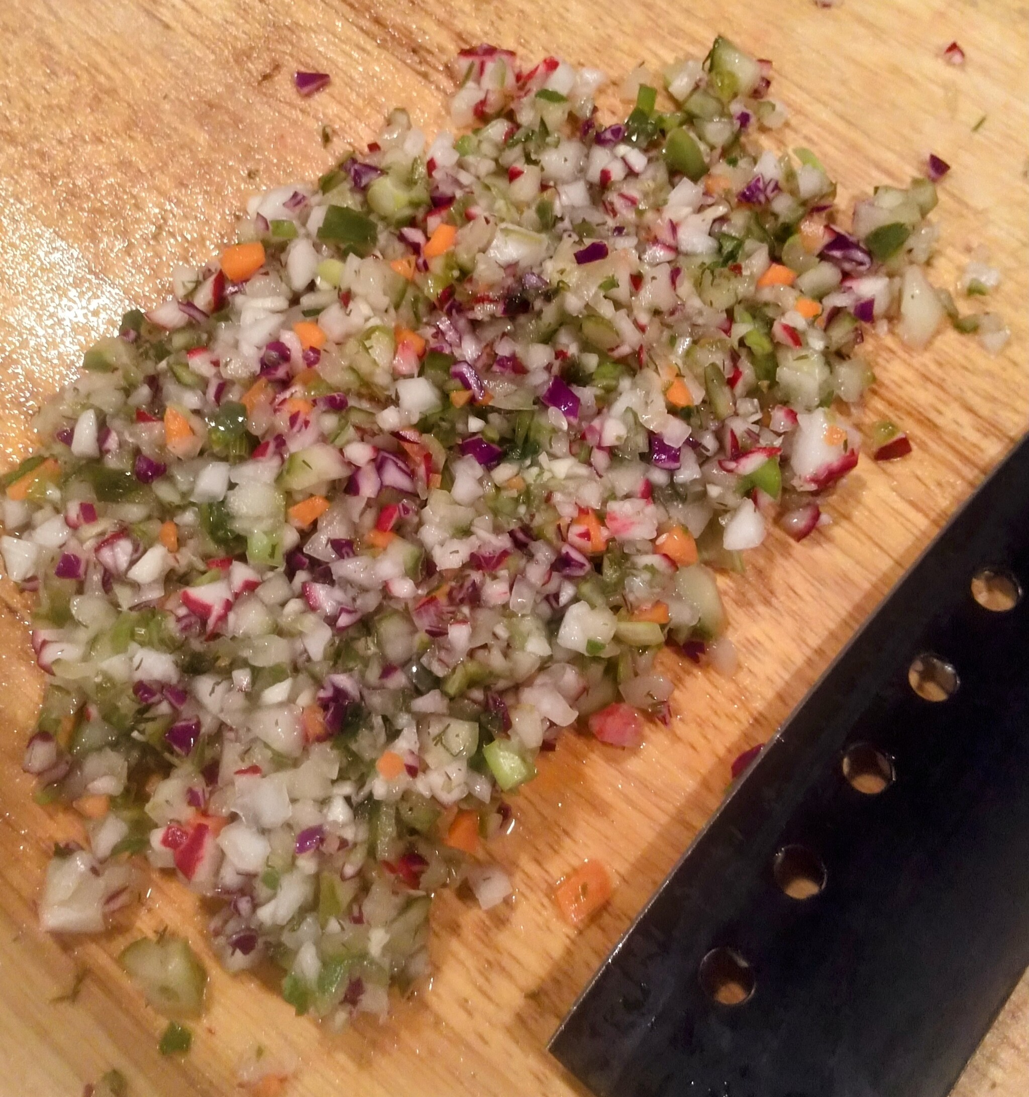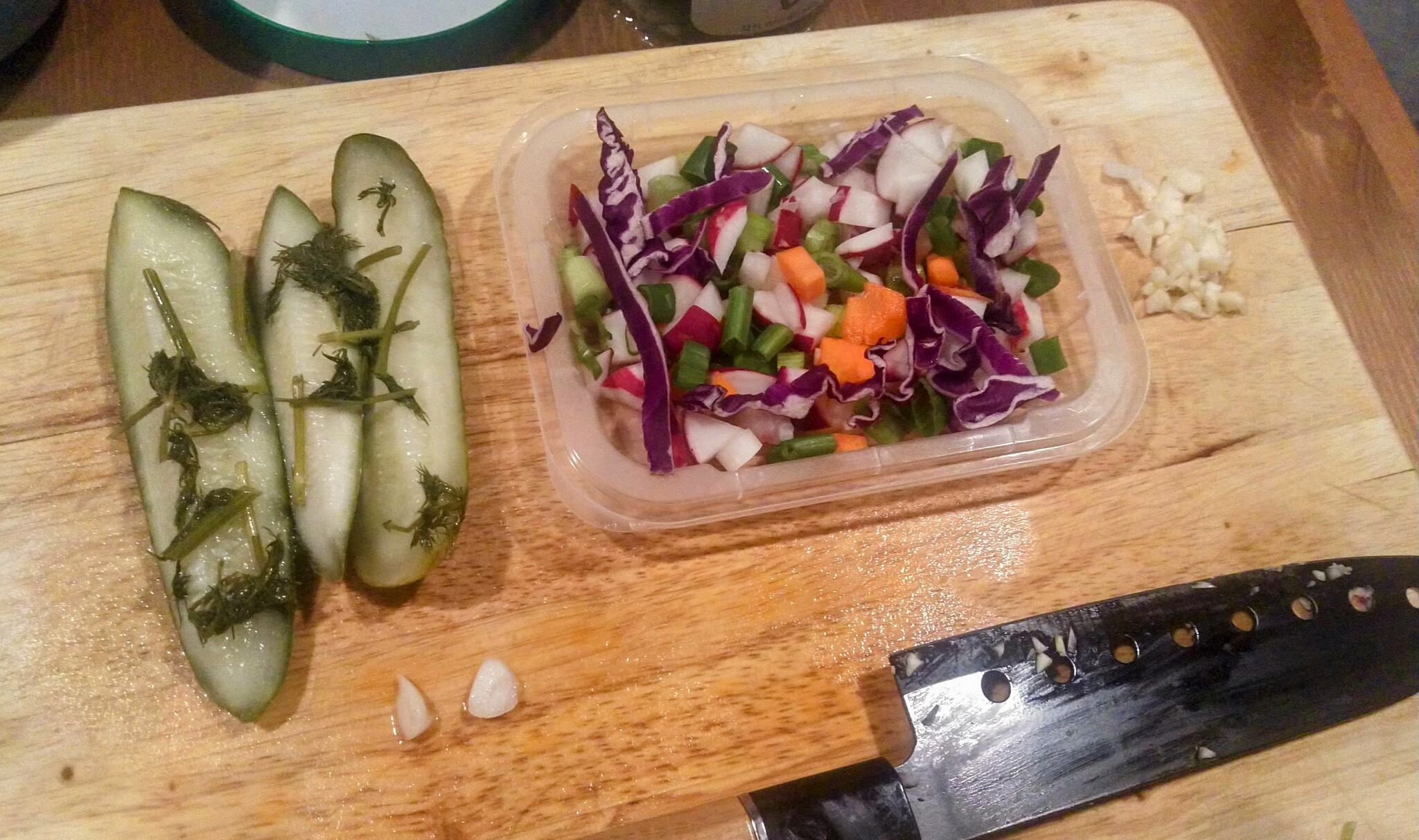 К маринованным огурцам прилагалось немного укропа и чеснока. У меня было много овощей, которые нужно было съесть, в основном оставшихся с суши-вечеринки. Так что немного моркови, чеснока, зеленого лука, красной капусты, редиса.