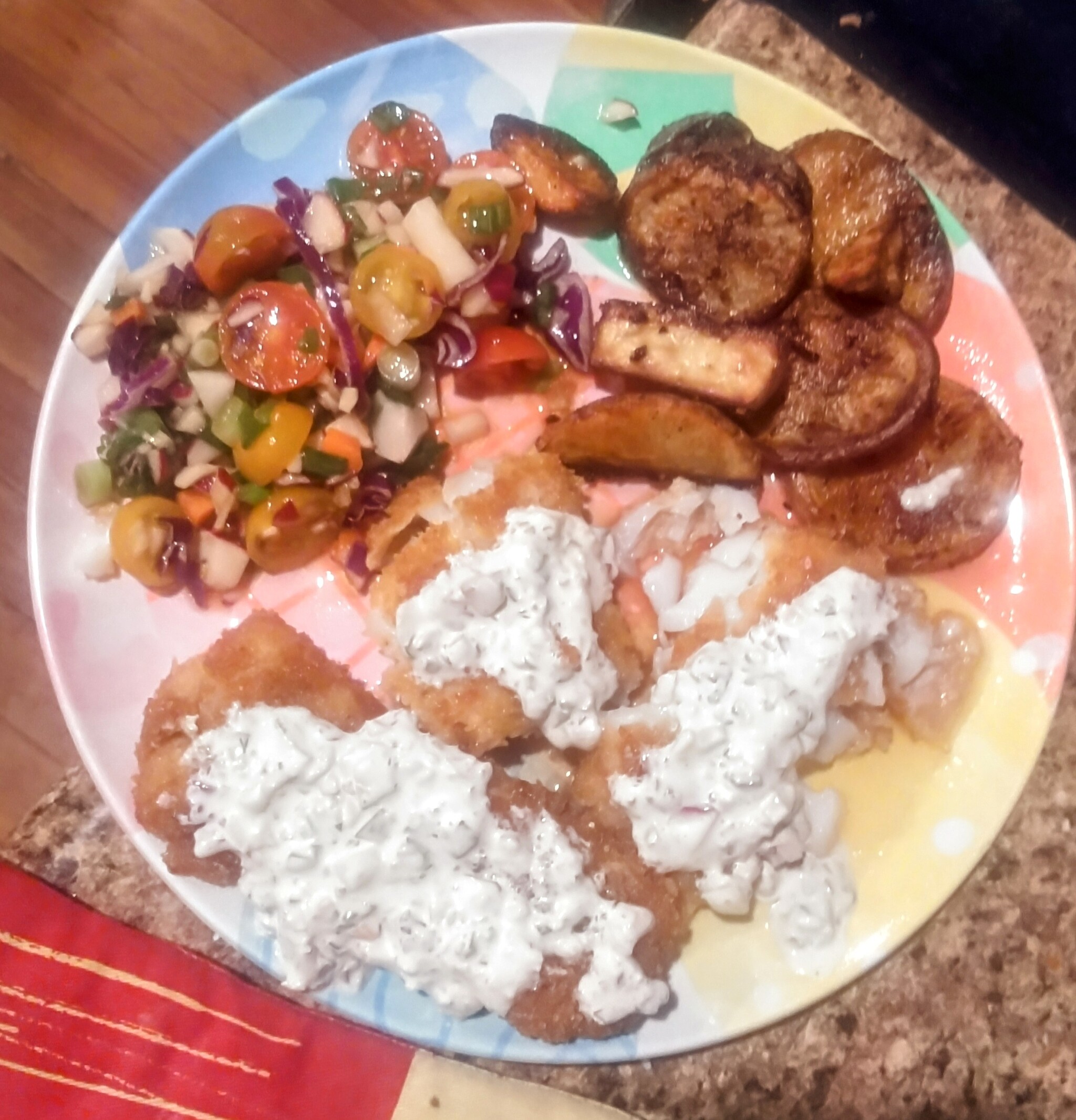 В любом случае, для этого эксперимента я использовал треску вместо пикши. Получилось так же хорошо, треска была на несколько долларов дешевле пикши. Мука, специи, панировочные сухари, яйца — все то же самое, что и в прошлый раз. Вместо «коулслоу» просто салат.