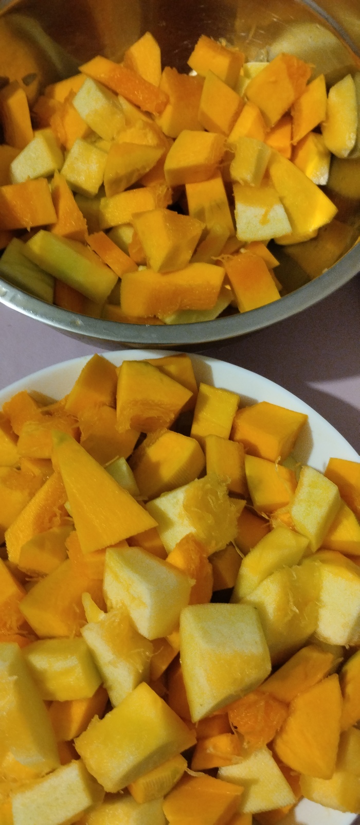Берём тыквочку, которая выросла у нас. Чистим, крошим на кусочки.
