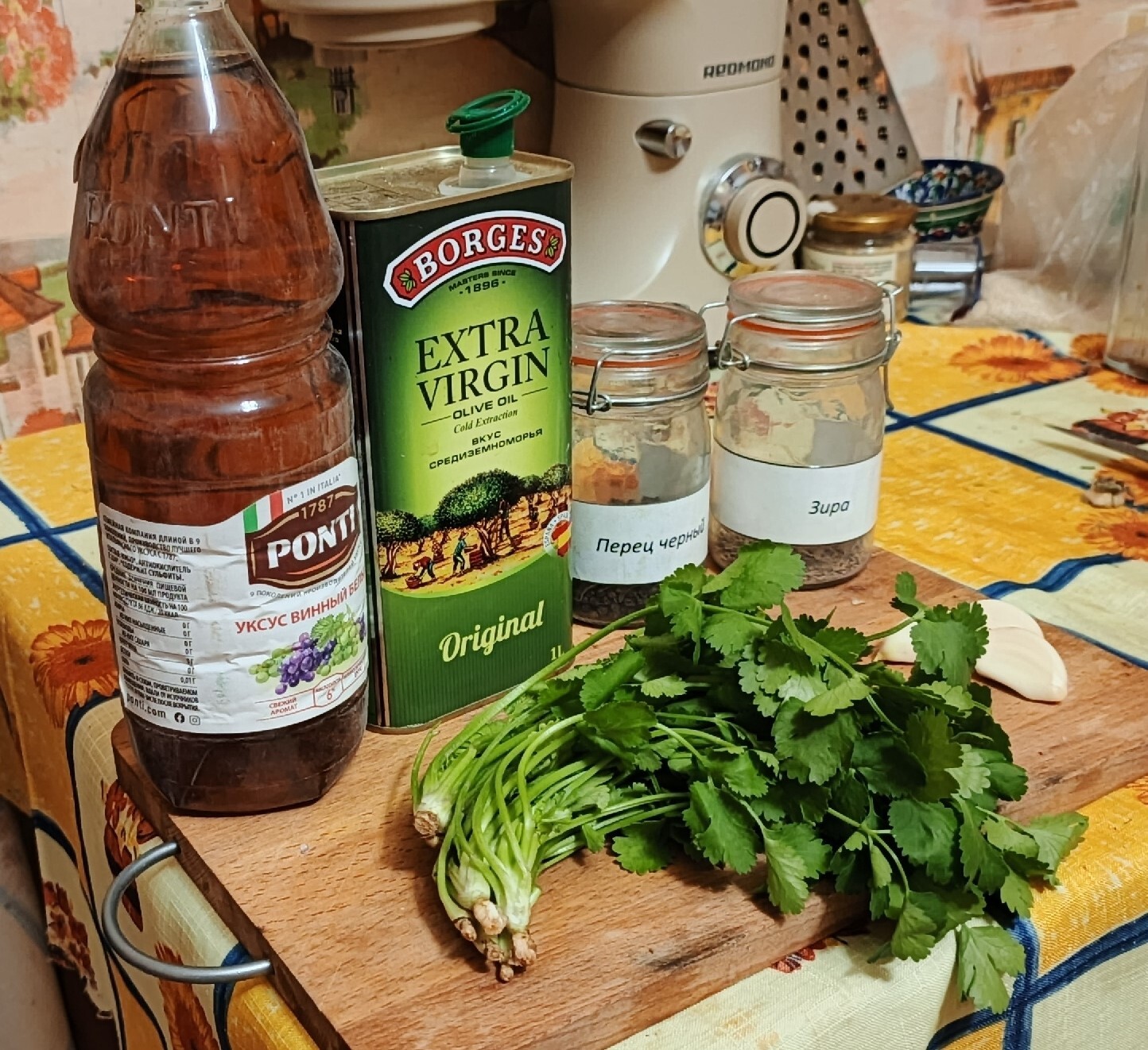 Поместите в чашу блендера зиру, очищенный чеснок, немного соли и зелень кинзы, добавьте ложку винного уксуса и как следует измельчите. После этого, понемногу добавляя оливковое масло первого холодного отжима, продолжайте взбивать соус, пока не добьётесь гладкой, однородной консистенции. В конце приправьте соус свежемолотым чёрным перцем.