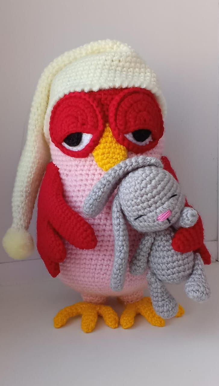 Вязаная игрушка ночная сова, которая держит в своих крылышках небольшого зайку. Вяжется совсем несложно. Для это мне понадобилось акриловая пряжа "Детская новинка" и крючок №2. В крыльях и лапах проволочный каркас. Колпак снимается. Сова стоит самостоятельно