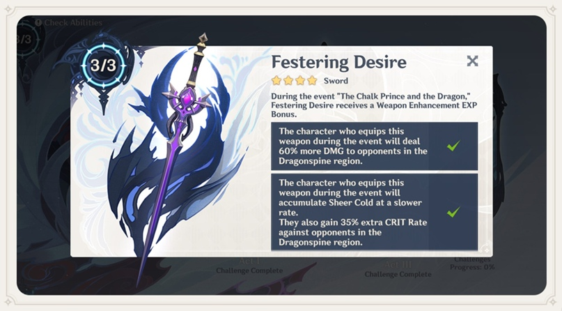 Выполняйте особые задания в период события, чтобы разблокировать усиления для меча Осквернённое желание. Персонаж, экипировавший этот меч, сможет воспользоваться этими особыми усилениями во время приключений на Драконьем хребте.