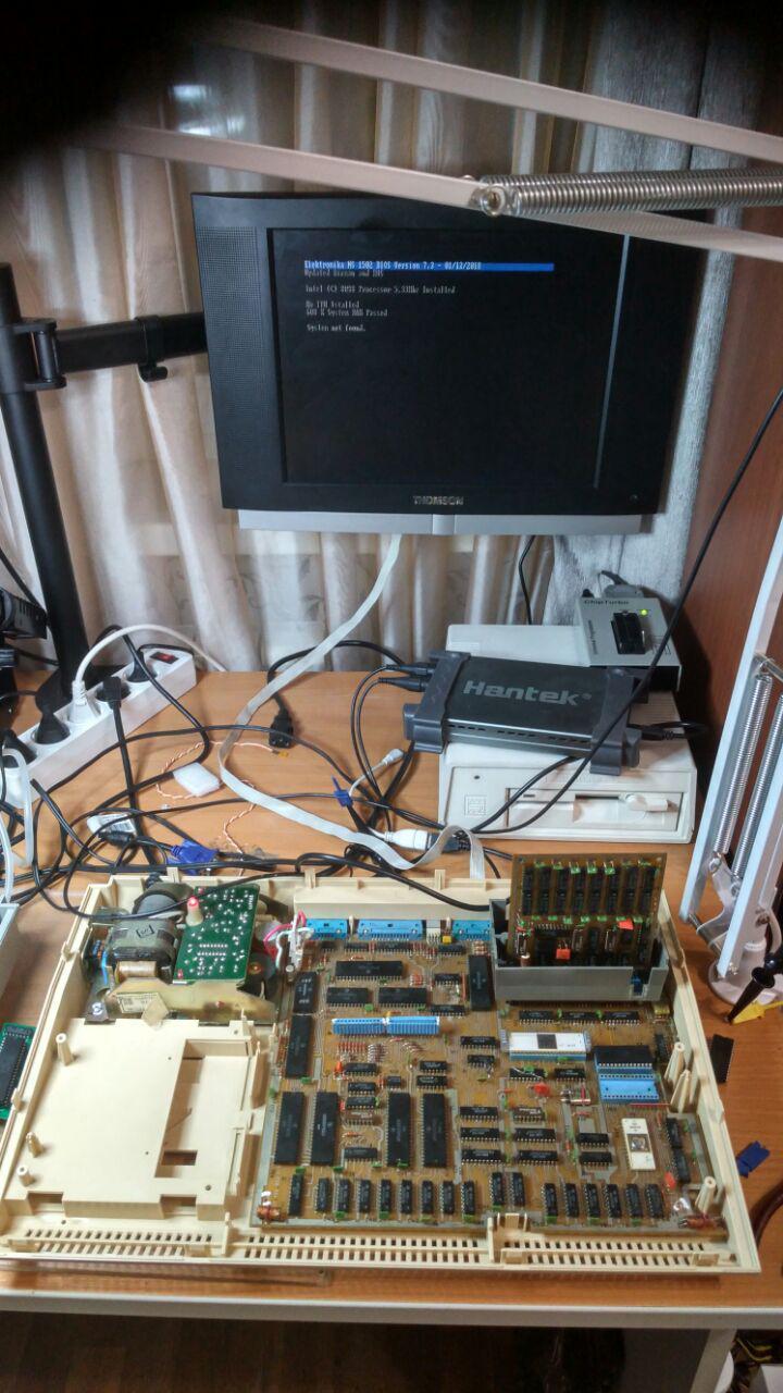 Чтобы уйти от загрузки с дискет, у меня была идея в свободные панели модуля ROM установить микросхемы с зашитым ROM-DOS'ом. Это, по сути, тот же MS DOS, но сильно урезанный. Один чешский энтузиаст заморочился такой штукой и создал версию DOS, занимающую небольшой объем (влезающую в два свободных окна в верхней части адресного пространства процессора) и способную «грузиться» из ПЗУ. Но у меня его прошивка не пошла, вероятно дело в несовместимом BIOSе. А так, можно было бы грузиться из микросхем ROM, это кроме того что происходило бы намного быстрее, так еще бы освобождало для работы второй дисковод.