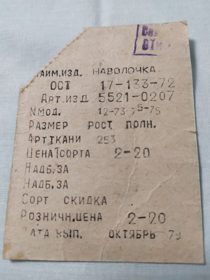 Ну так вот, предусмотрительно спросил у отца, остались ли на них вообще наподушники. Есть, говорит. Белые, новые. Натянул один на подушку, несéт мне еé с биркой в зубах. По виду бирки я сразу понял, что это опять артефакты из тех времéн, когда мои родители ещé знакомы не были. И действительно! Наволочка 1979 года.
