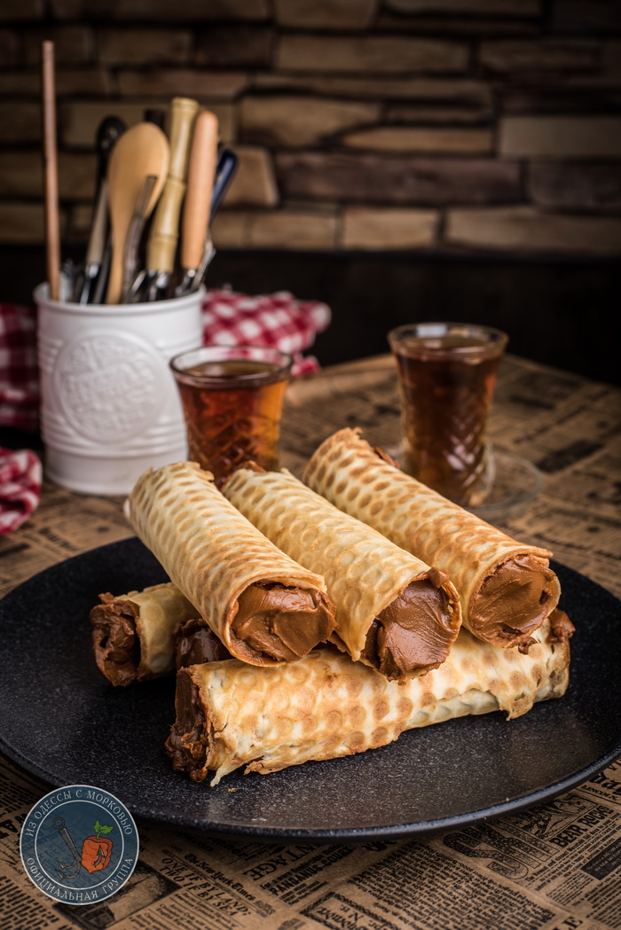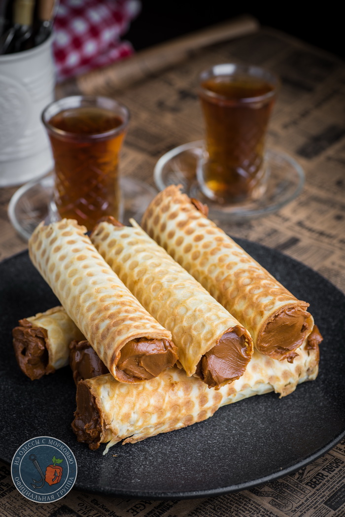 - Теперь надо только быстро скрутить трубочку или конус, пока тесто горячее и податливое. Секунд через 10-15 оно остынет и скрутить уже не получится. В качестве подручного средства я не нашел ничего лучше и раскрутил деревянную ручку от сковородки и накручивал вафлю на нее. Оказалось очень удобно. В качестве конуса можно сколхозить оный из картона и скрепить скрепками. Осталось лишь наполнить трубочки начинкой. Я не стал городить огород и просто взял готовую вареную сгущенку «ириску». В следующий раз попробую с заварным кремом.