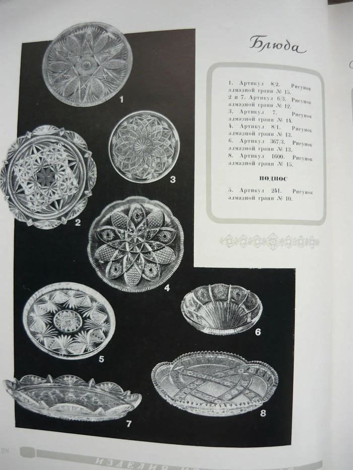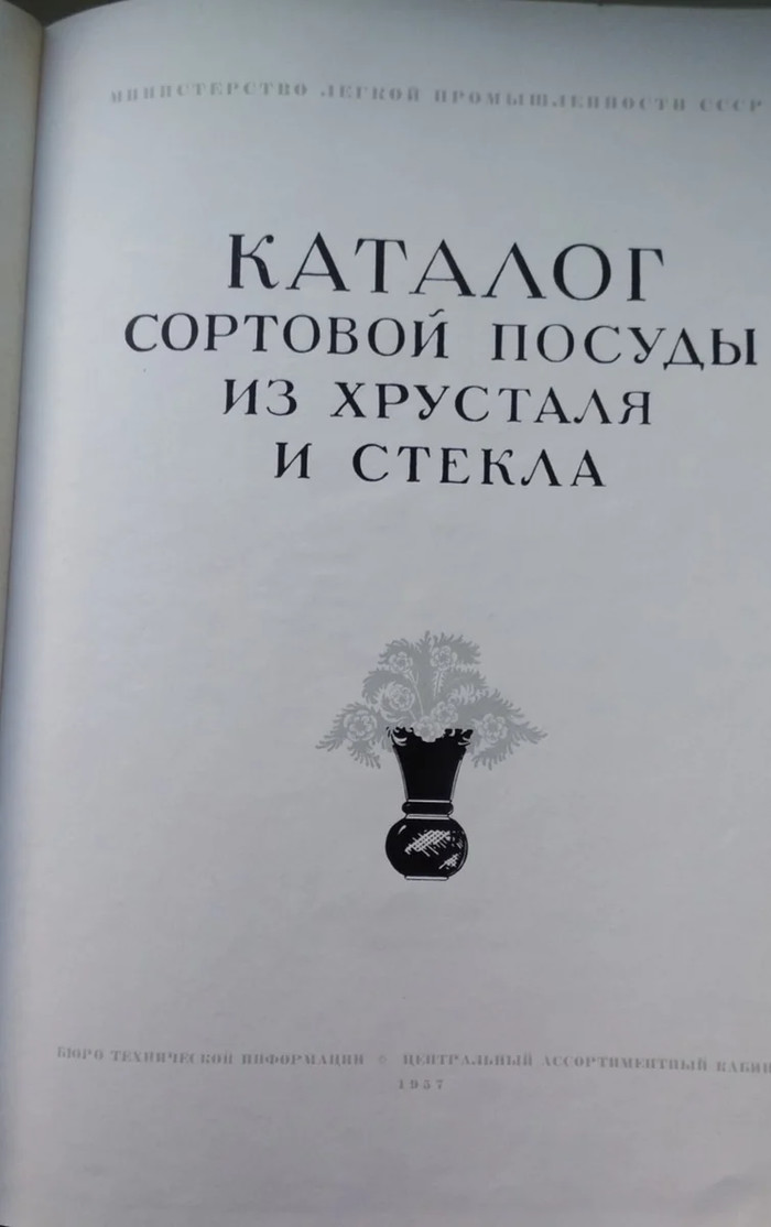 Вчера вечером посетил по делу антикварный магазин своего товарища, и увидел среди книг каталог сортовой посуды из хрусталя и стекла, 1957 года. Я конечно захотел его купить, или взять с собой для качественного копирования. Но оказалось что утром его должны забрать, уже внесли задаток. Поэтому пришлось сразу взяться за дело и сфотографировать все страницы. Не судите строго за качество фотографий, пришлось снимать практически на коленках. Но информация интересная, многие узнают свои домашние изделия из сервантов.