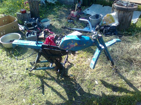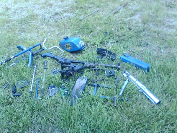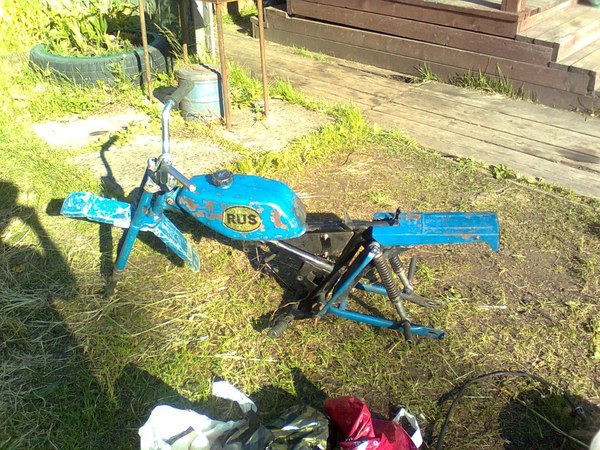 Далее, от нефиг делать, было решено собрать то, что есть. Не хватало очень много - я не говорю про колеса и двигатель. Лишними оказались перья (может не так назвал - амортизаторы в вилке) да и руль оказался от велосипеда.