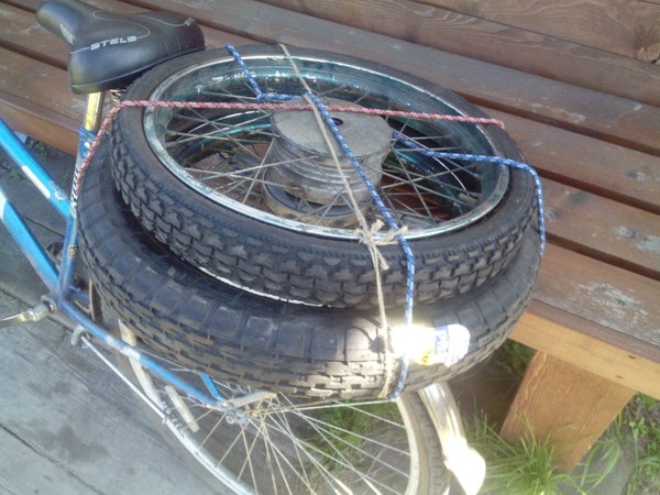 Были поиски каких-либо деталей или мопедов-доноров в объявлениях, но таких не было. Попытки найти что-то путем подачи своего "куплю" не увенчались успехом. Но, подвернулось объявление в "Вконтакте" о продажи колес на "Карпаты" за 500 рэ. При покупке оказалось, что это колеса от "Дельты". А на заднем колесе стоит покрышка и камера от "Восхода". Я был очень рад :D Парень, который продал мне их в подарок отдал переднюю часть "Дельты" (руль, вилка, "горшок").