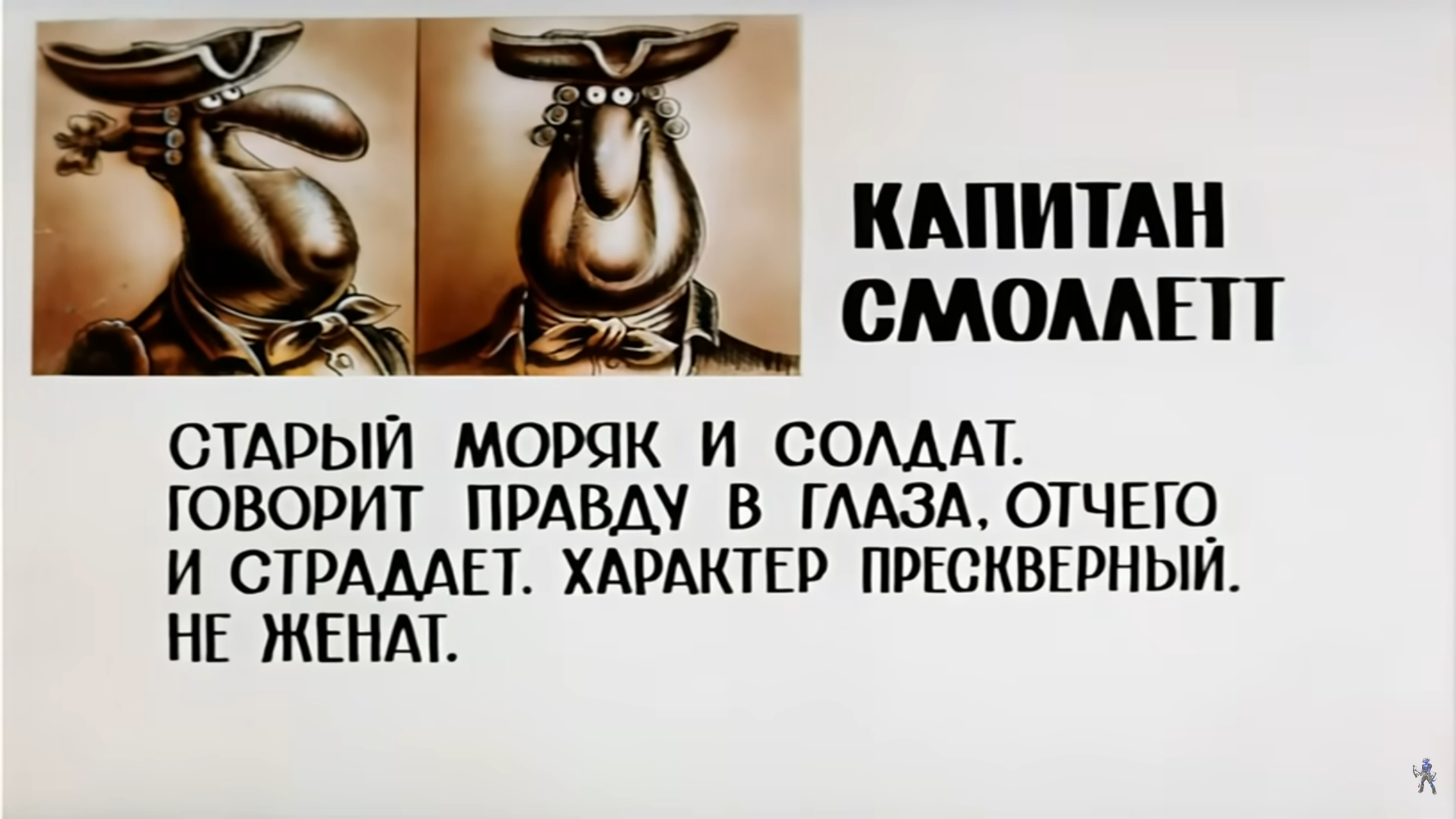 Обожаю советский мультфильм "Остров сокровищ" (1988). Во-первых, потому что Стивенсон. Во-вторых, там туева хуча юмора, пасхалок и отсылок на другие советские фильмы и культурные явления. Чего стоят биографии-картинки главных геров в стиле "Семнадцати мгновений весны": характер прескверный, не женат.
