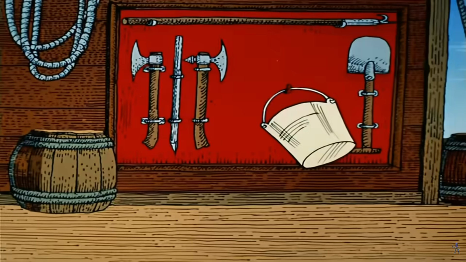 Но сильнее всего меня разрывает от сцены, где на корабле 18 века висит советский уголок пожарной безопасности. Да-да — красный стенд, ведро, лом, багор, топор, лопата. Один из разбушевавшихся пиратов палит из пушки в стиле Рэмбо, и другой советует остудить его пыл.