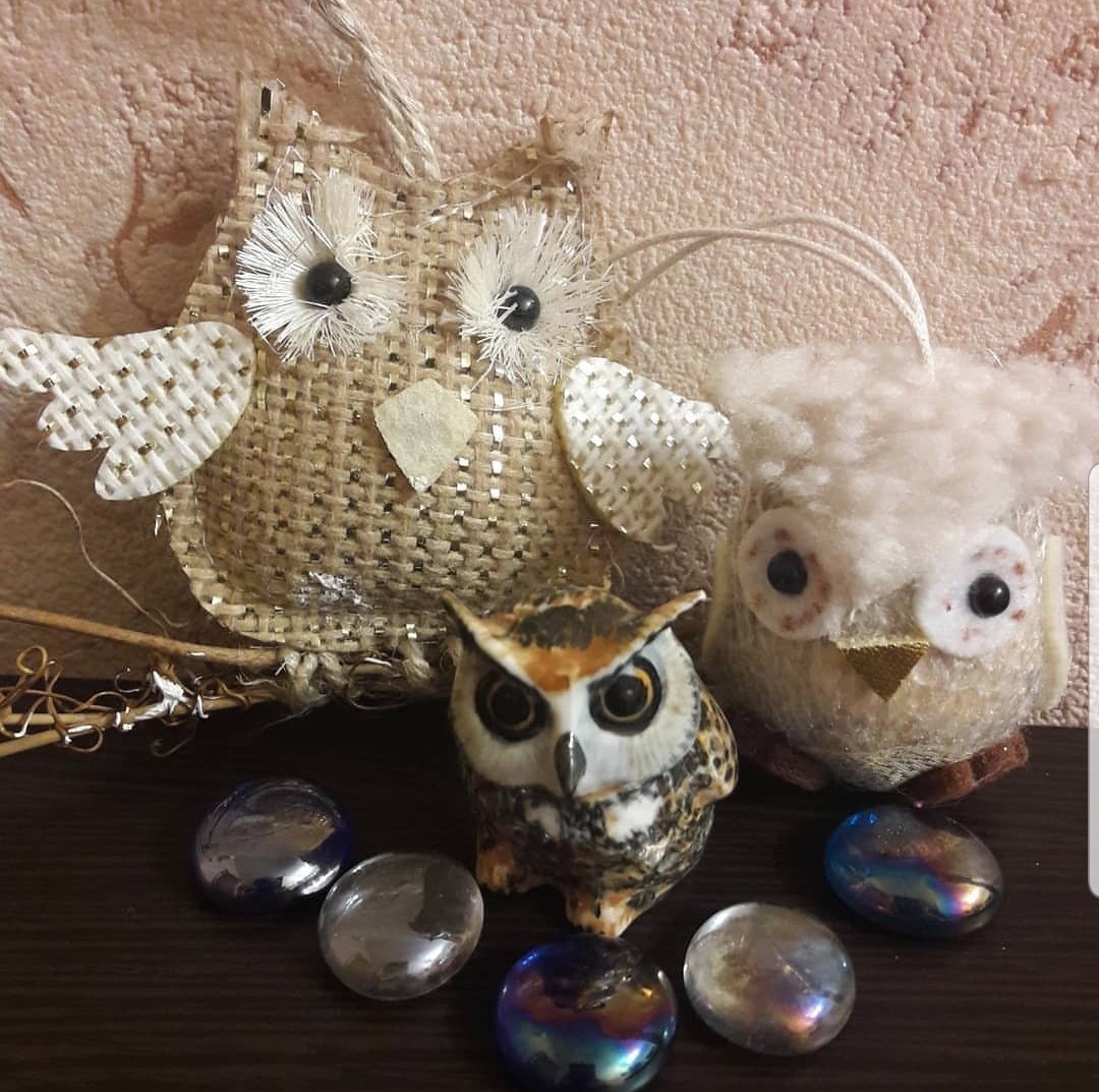 Позолоченная пернатая появилась у нас после совместной с мужем поездки в Москву, а красавца филина привез супруг, будучи в командировке в той же Москве. Вместе с филиным муж привез еще двух мягких совушек на новогоднюю ёлку.
