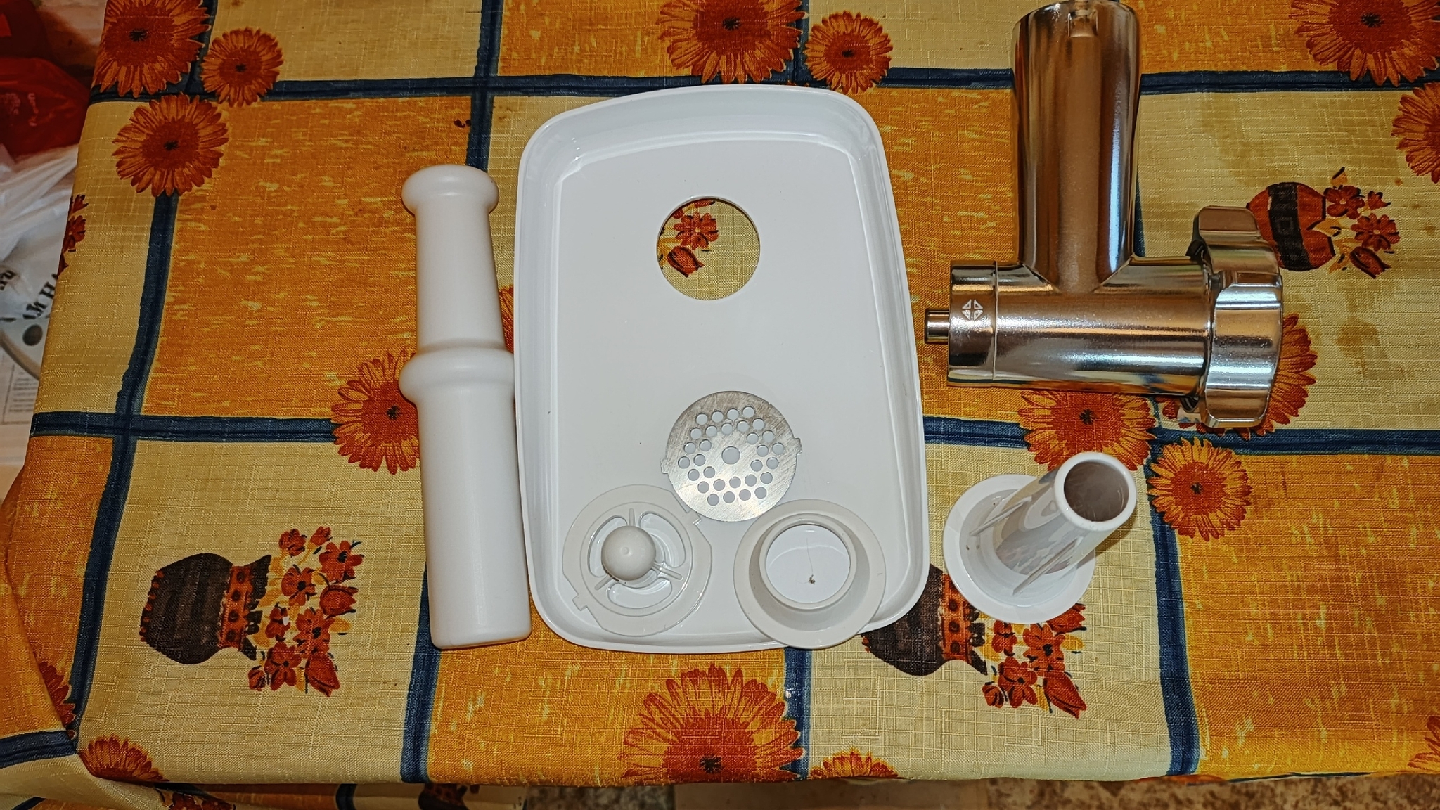 Мясорубка со сменным и вспомогательным инструментом. Две решетки крупная и средняя. Мелкая если и есть, то надо отдельно покупать. Длинная белая это насадка для формирования колбас, мелкие для кеббе. Как я понял, это средиземноморские зразы. Снаружи фарш с крупой, внутри с орешками и луком.