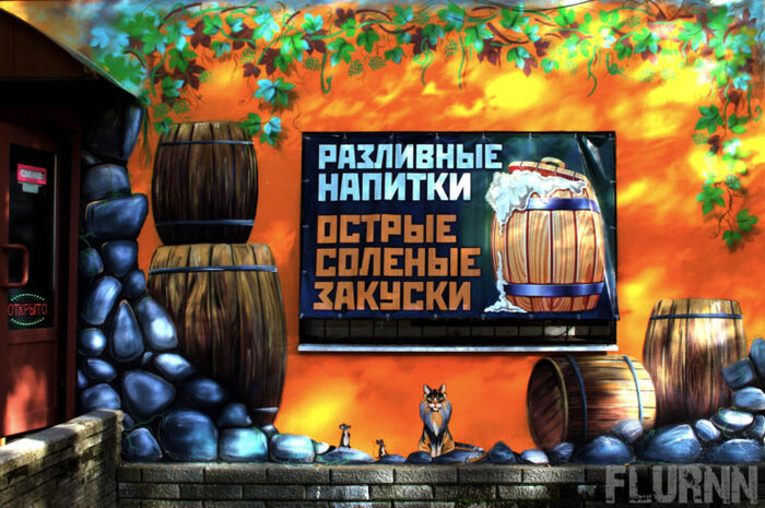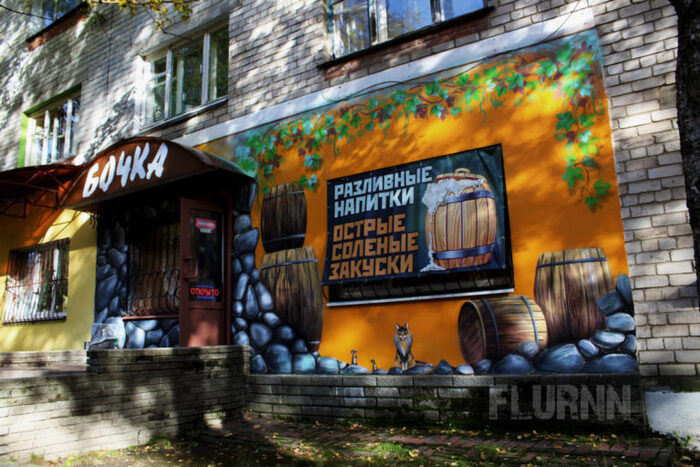 Наша команда выполнила несколько подобных проектов в Нижнем Новгороде. Они носили коммерческий характер, например граффити на фасаде пивной Бочка. Рисунок сделан в 2014 году. На всех этапах был выдержан технологический процесс нанесения, благодаря чему рисунок не выгарел и не облупился за прошедшие годы.