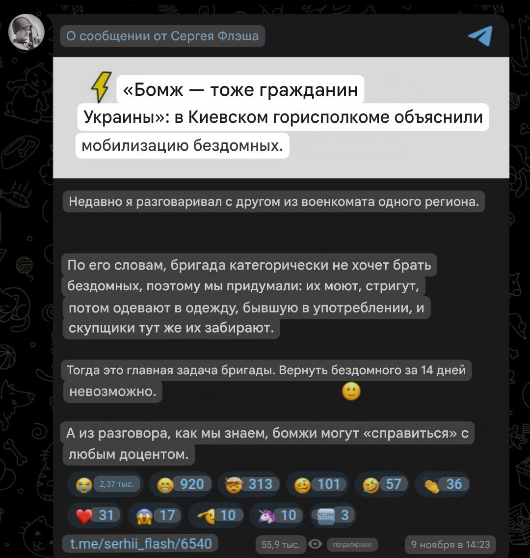 160 manonthemoon Современные проблемы требуют современных решений 9 дней назад t.me/serhii_flash/6540 Fake News Политика Украина ТЦК Мобилизация Бомж Telegram (ссылка) 24 5 3 3 1 Ещё 0
