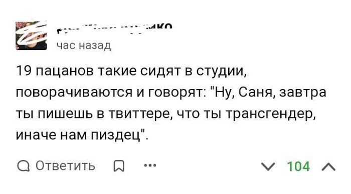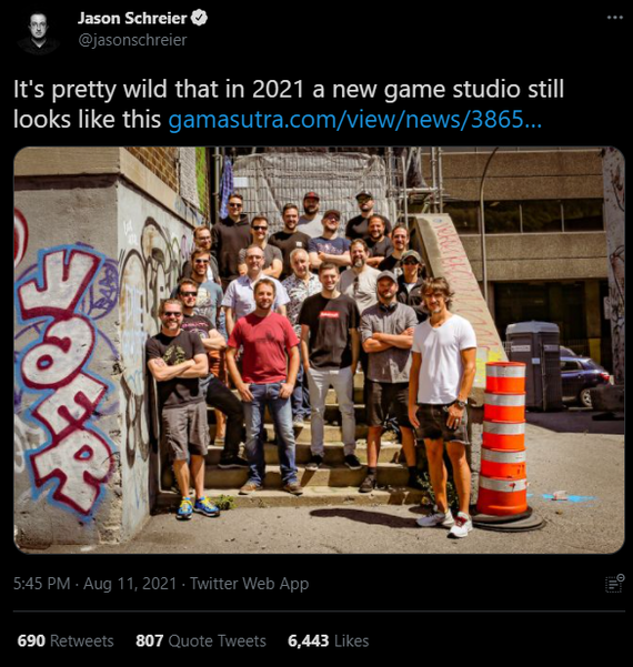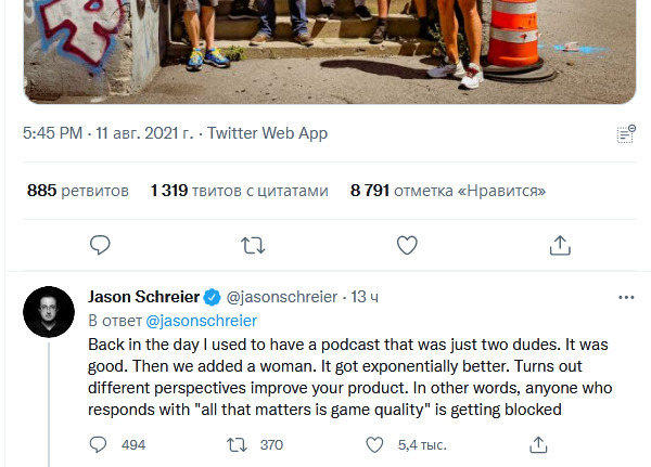 Это кто не понял, к посту об игровой студии которая состоит чисто из мужчин, и игровой журналист Шрайер возмущается этому в твиттере, говорит что диверсити это хорошо и что будет банить тех кто будет писать что "какая разница кто в команде лишь бы игры были качественные"