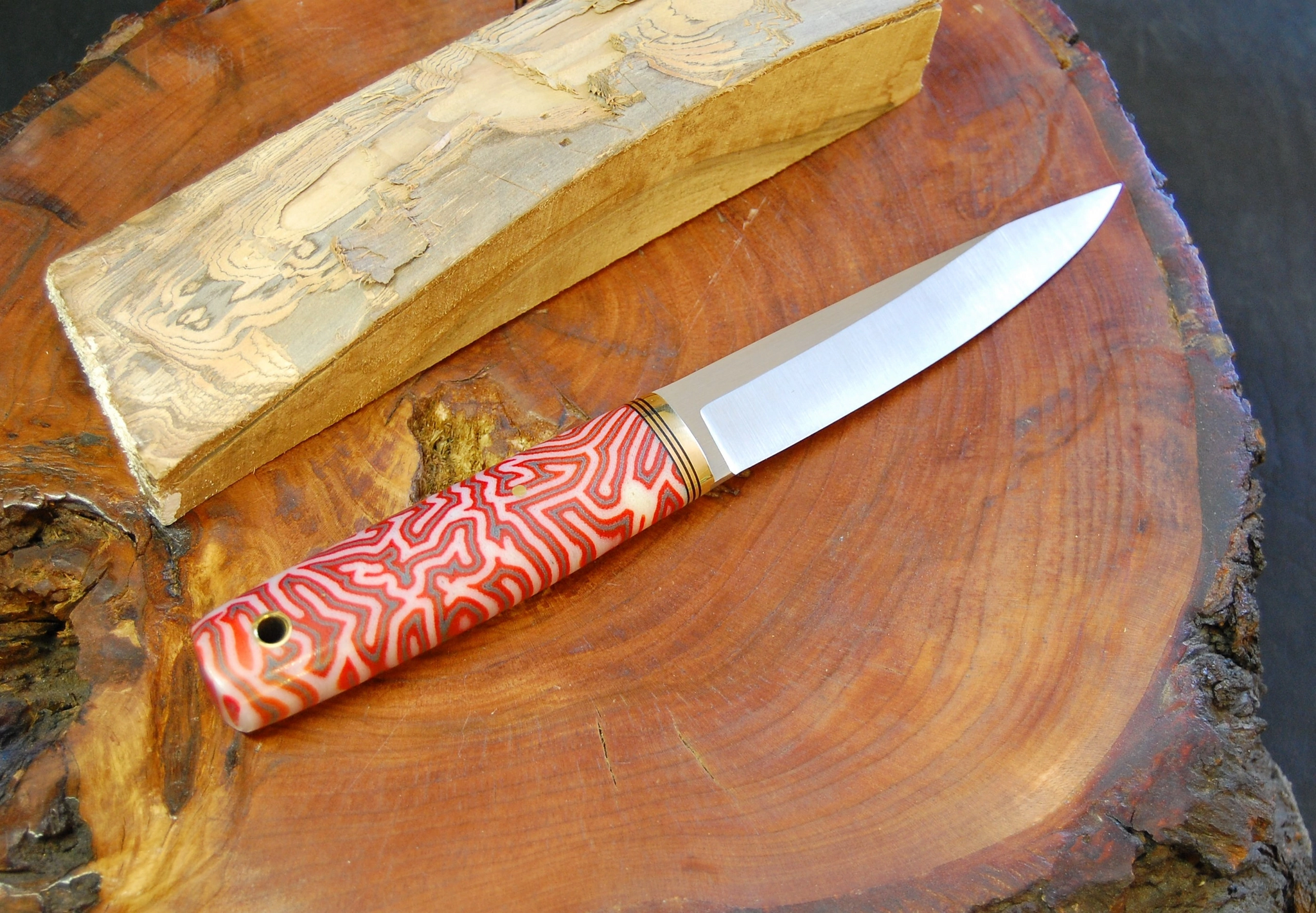 Сталь на клинке нержавеющая AUS10co, 3 мм толщиной. Спуски прямые, высокие. Сведение примерно 0,1 мм. Продольный сатин на голомени и рикассо клинка. Рукоять из самодельной яркой микарты. Для любителей терять ножи в лесу самое то) Просто так не потеряется. Центральный пин через хвостовик клинка из латуни 3 мм. Темлячное отверстие в виде латунной трубочки 8 мм.