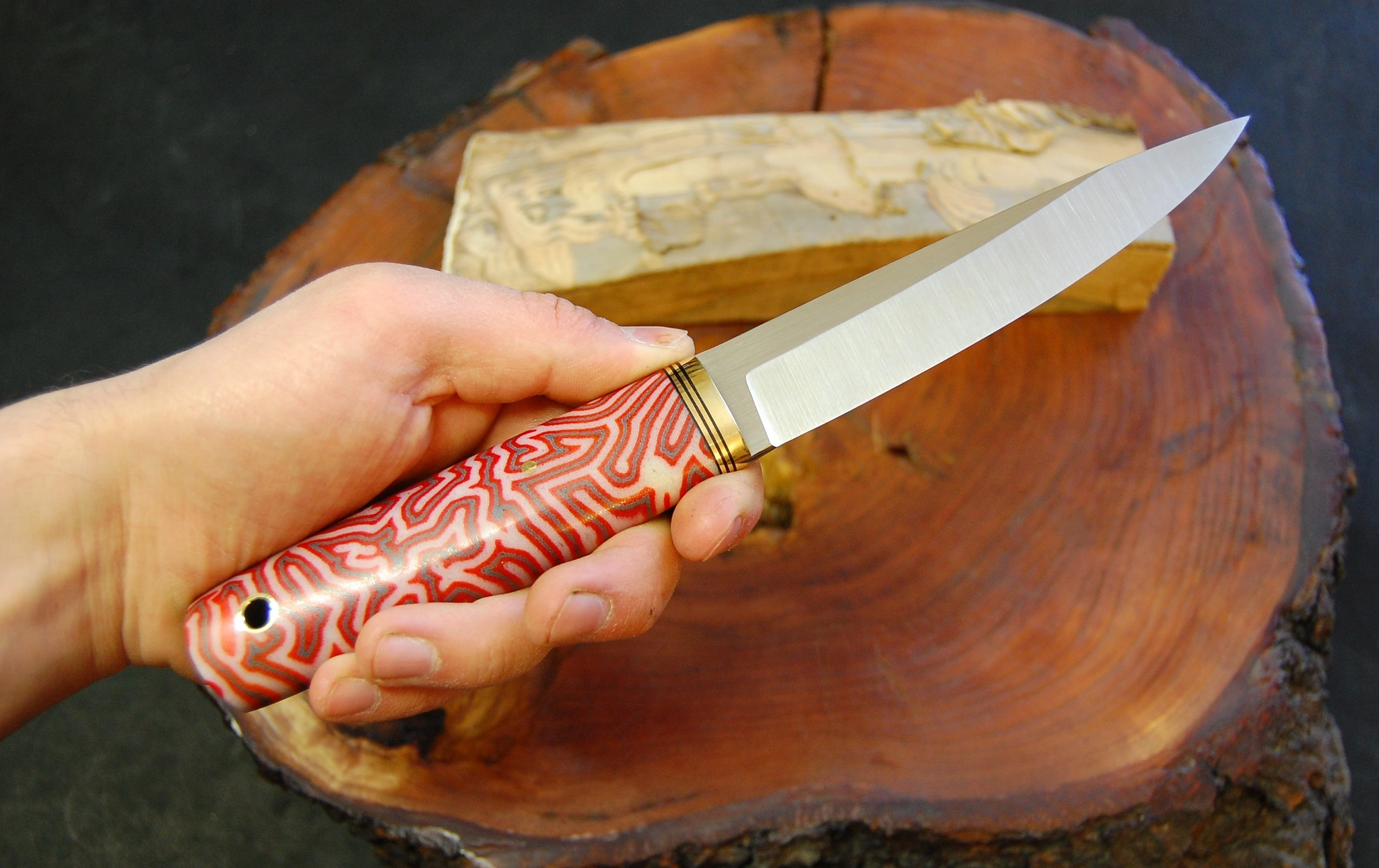 Вот такой вот нож получился. Размерами наверное немного большеват, я привык к ножам поменьше, но это чисто мое мнение. Микарта как всегда меня радует, яркая и хорошо обрабатывается