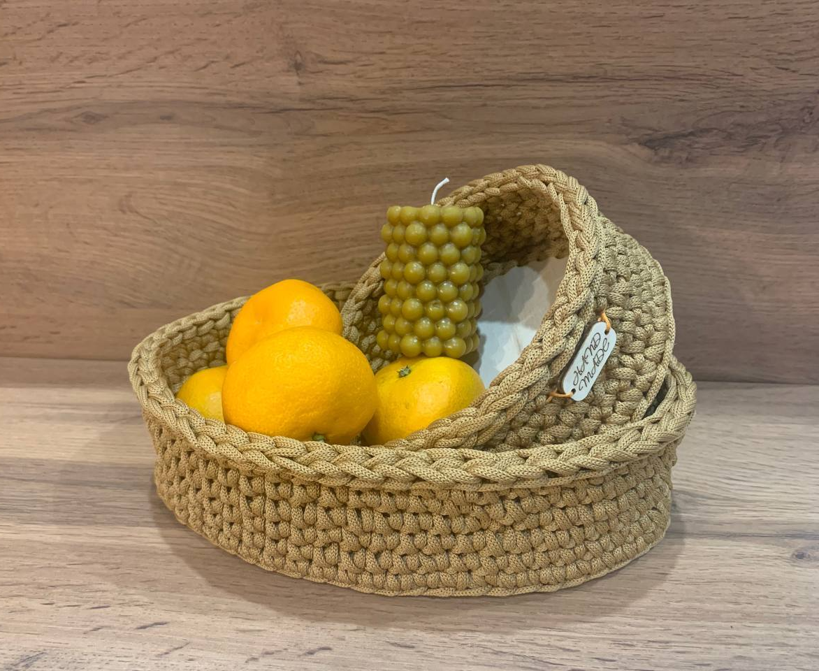 - милые корзинки, связанные с заботой и теплотой (из полиэфирной или трикотажной пряжи, из джута или плюшевой пряжи);