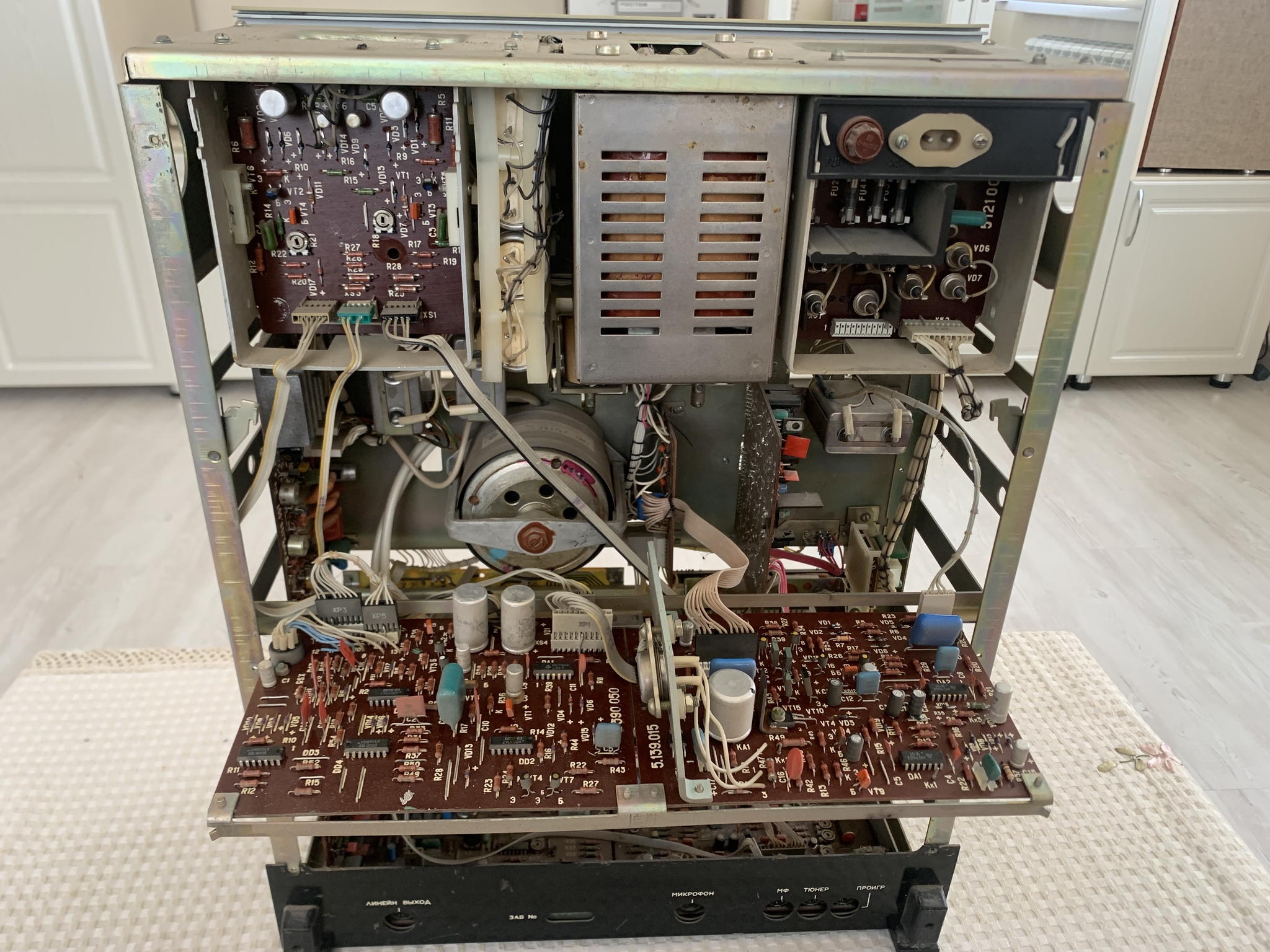 Ко мне магнитофон пришел исправным, но с рядом недочетов в работе. Перечислю: самопроизвольные отключения и щелчки в звуке, слабая отдача амплитуды записанного сигнала на высоких частотах. Разобрав устройство первым делом осмотрел все блоки и заметил, что не все электролитические конденсаторы были заменены - доменял. В блоке питания обнаружил, что предохранители еле держатся в своих гнезах, а лепестки этих гнезд, буквально, отваливаются при прикосновении, это и явилось причиной самопроизвольных отключений: