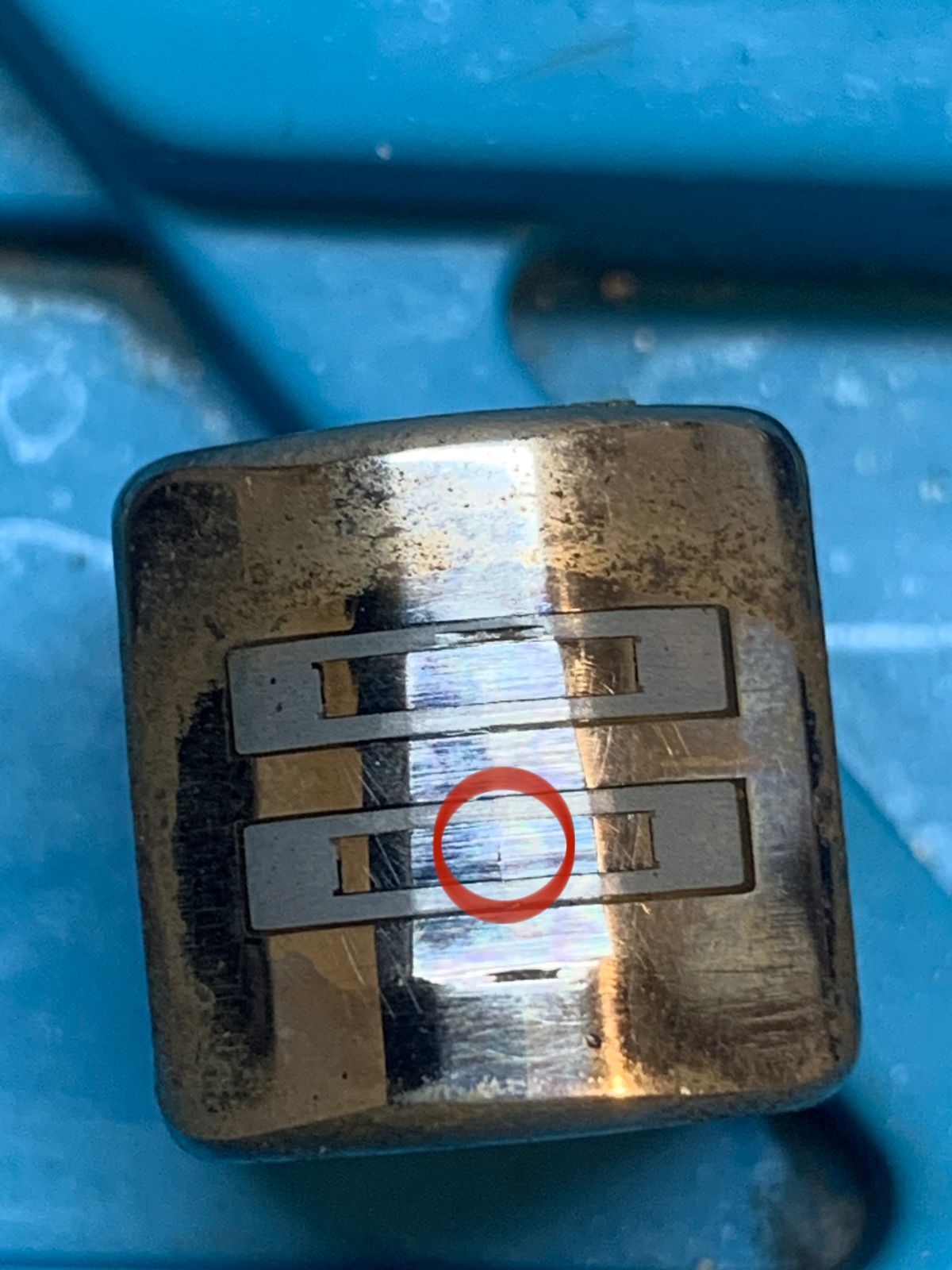 Так как таких держателей предохранителей у меня нет, решил проблему путем пайки отломанных и поврежденных лепестков к основанию гнезд, держатся крепко, повезло что материал этих держателей легко лудится. Далее осмотр головок и тут при приближении удалось заметить, что ввиду мех контакта с лентой, со временем образовался значительный износ, приведший к вскрытию зазора головки записи: