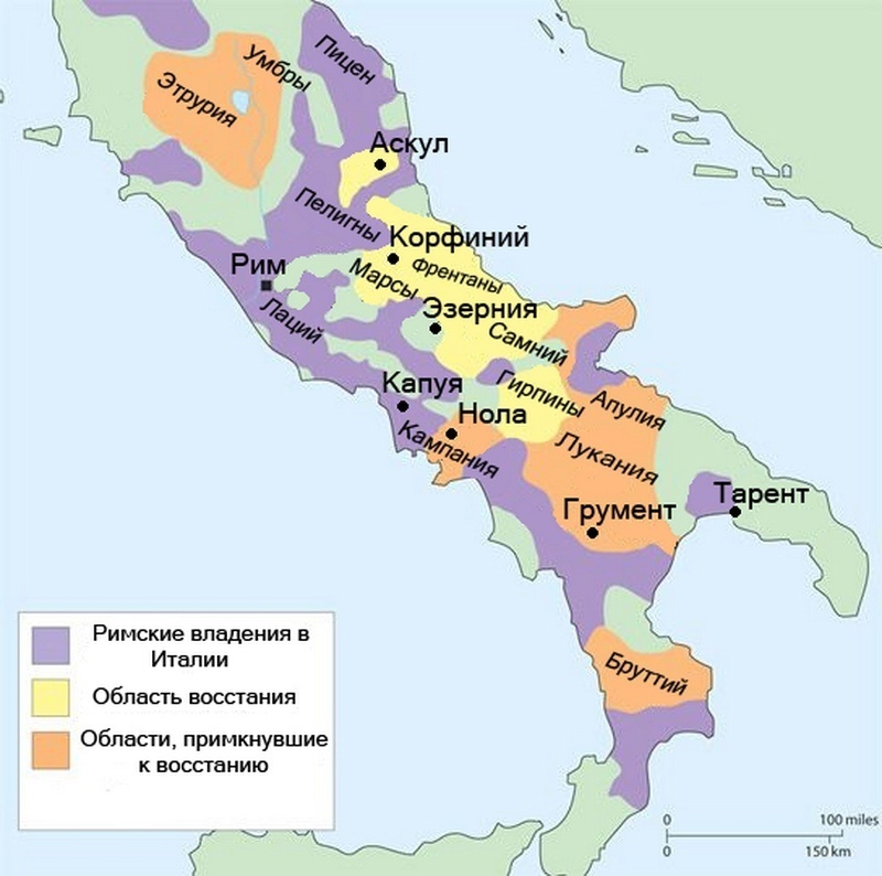 Во-вторых, произошедшие события заставляли римлян серьезно опасаться того, что лояльные пока что общины италиков тоже могут восстать. Римляне были хоть и многочисленны, но италиков то было больше. Латинам и колониям латинского права, положим было терять от восстания куда больше, нежели другим, а значит риски их восстания минимальны. А вот остальные могли. В памяти ведь еще были свежи воспоминания, как часть юга Италии встала на сторону Ганнибала. Если заполыхает не только центральная Италия, но и север с югом, то Рим будет биться в окружении.
