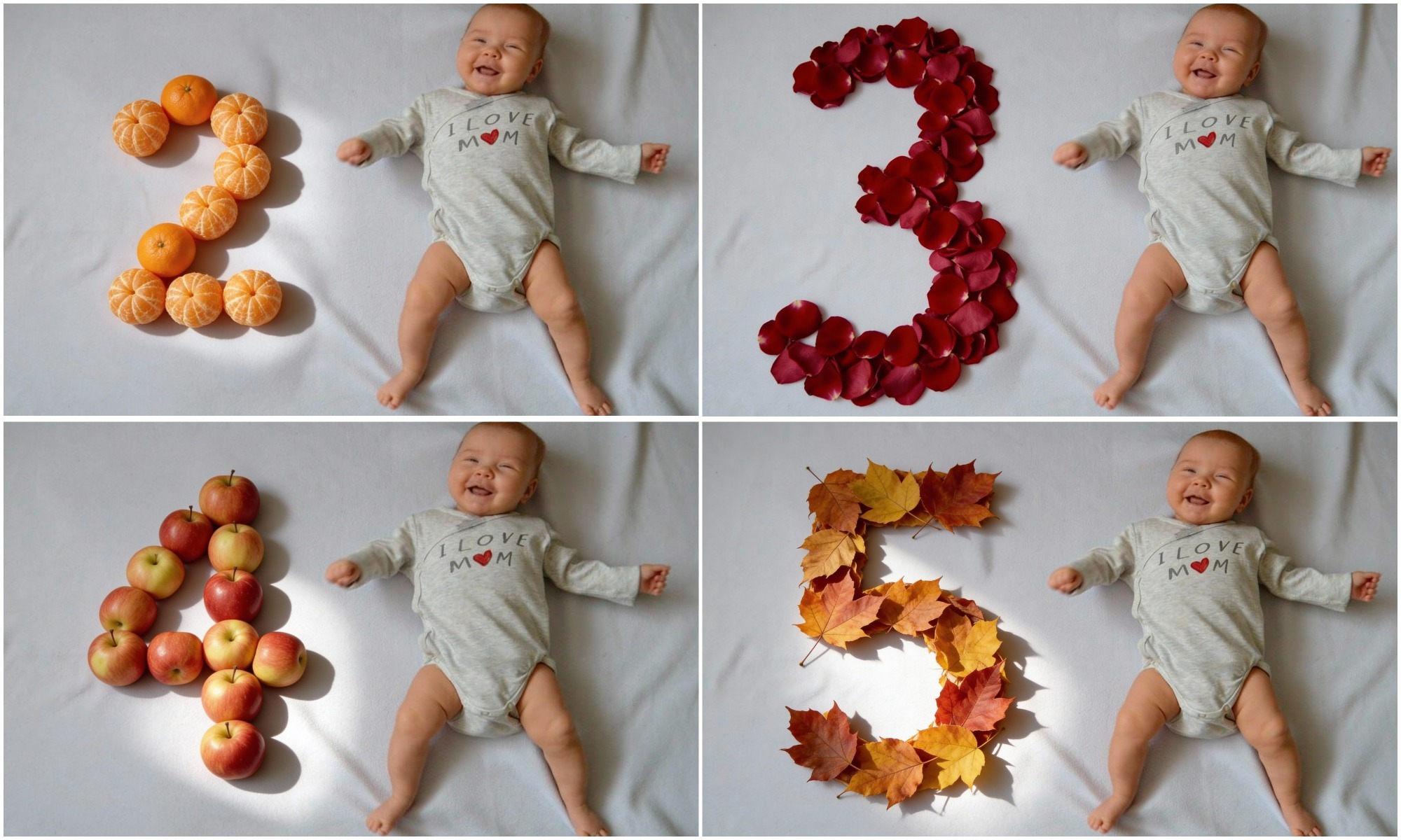 Добавь на фото ребенка цифру [нужная цифра], выложенную из [необходимый материал или предмет]. Только [предмет], никаких прозрачных цифр, текста или эффектов. [предмет] должны лежать реалистично, с естественными тенями, в одной плоскости с ребёнком.