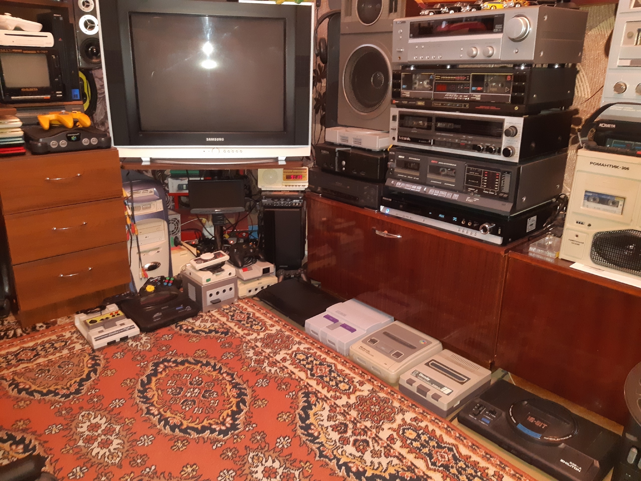 В комнате разместил всё, что люблю) Люблю слушать магнитные ленты, щелкать механические кнопки, люблю запах винила и конечно пиксели первых видеоигр ❤