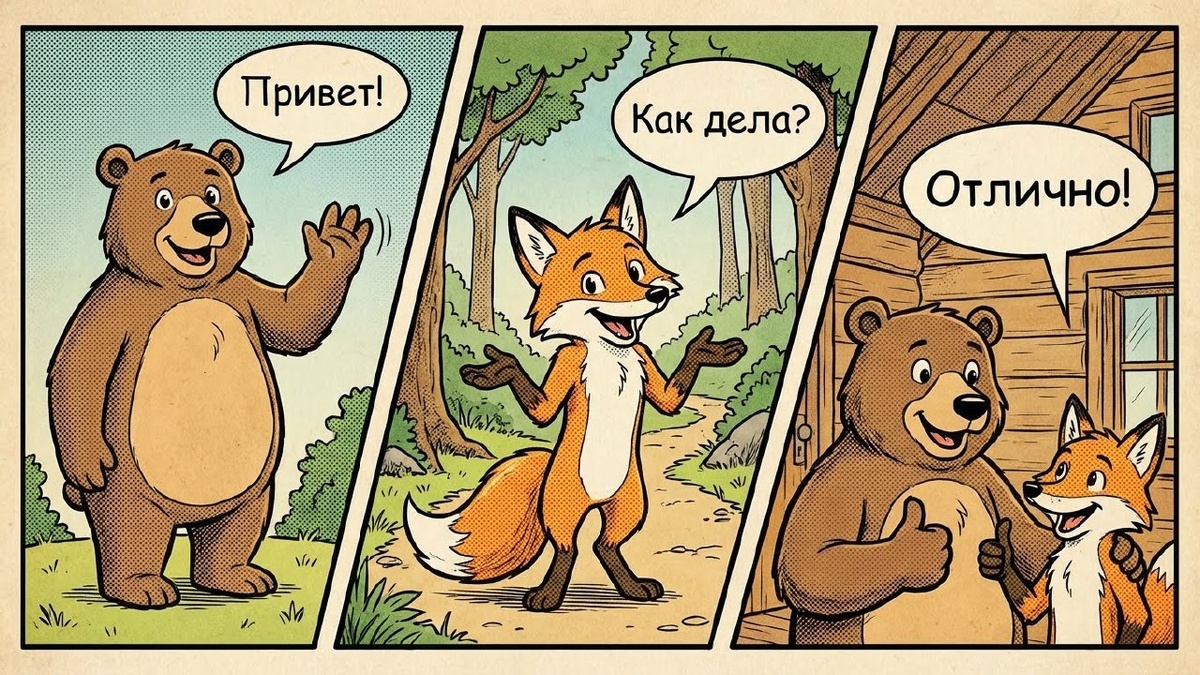 Сделай комикс из этих трех фото: первый кадр — в левом верхнем углу с репликой 'Привет!', второй — по центру с подписью 'Как дела?', третий — внизу справа с текстом 'Отлично!'. Оформление классическое, черные рамки.