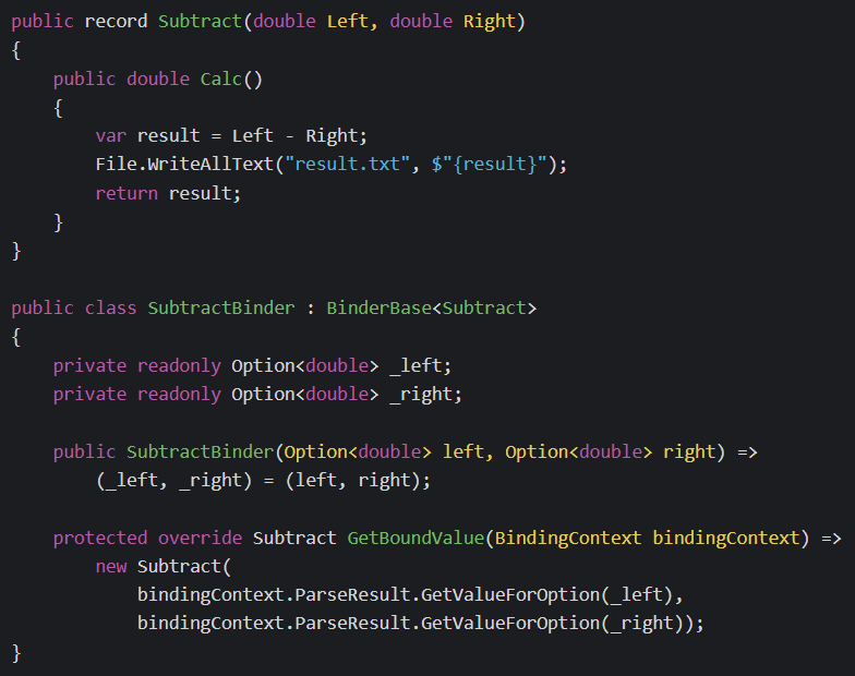 Помимо примитивных типов, библиотека также поддерживает массивы, списки, FileInfo, DirectoryInfo и другие. Полный список можно узнать, заглянув в документацию. Если есть необходимость привязать опции к кастомному типу, то можно воспользоваться встроенным механизмом привязки через тип BinderBase<T>. Определим операцию вычитания, используя этот способ: