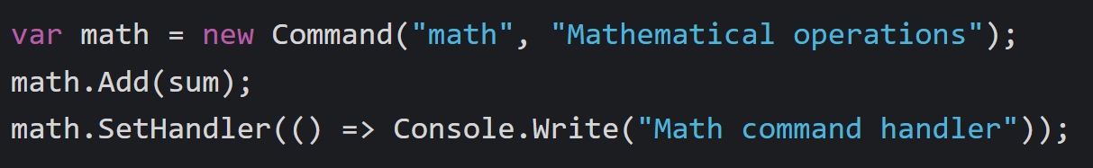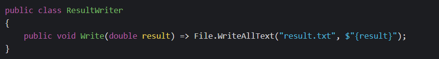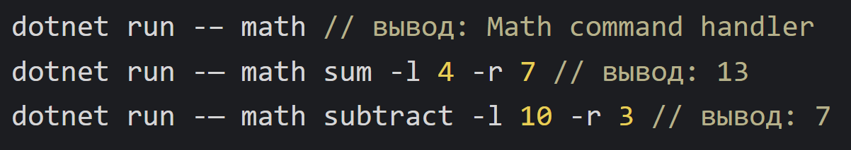 Классические контейнеры зависимостей не рекомендуется использовать, поскольку зависимости одной команды могут быть совершенно не нужны для другой команды, а инициализация всех зависимостей может увеличить время запуска CLI-приложения. Вместо этого можно воспользоваться механизмом внедрения зависимостей для конкретного обработчика. Для этого снова понадобится класс BinderBase<T>. Определим новый класс ResultWriter, который будет записывать результат математической операции в файл: