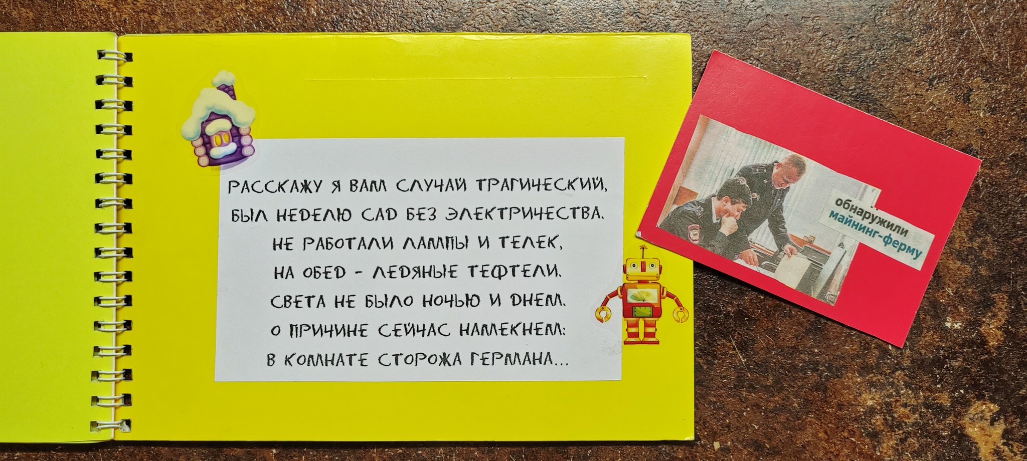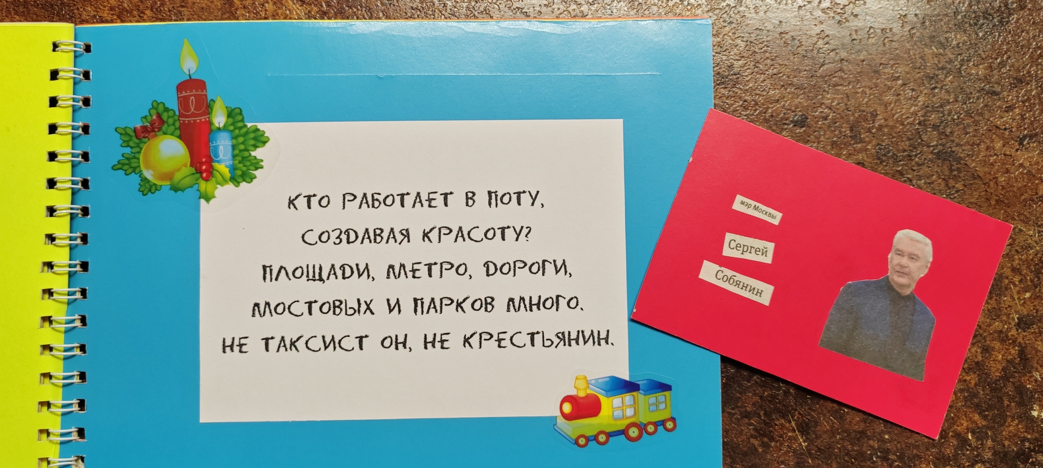 - эффект неожиданности: изюминка, которая, по моему замыслу, должна была сделать книжку более запоминающейся - финал стихотворения спрятан на карточке, которую нужно вынимать из страницы.