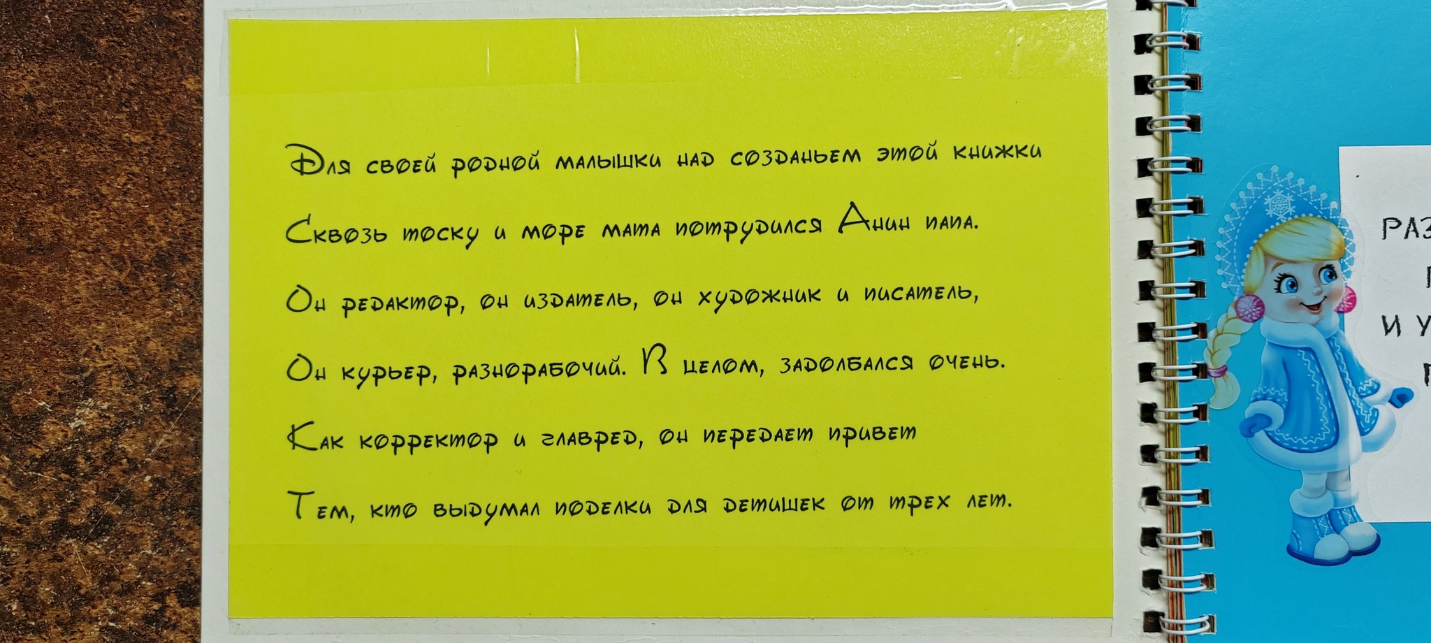 В общем, про книжку-малышку я понял правильно. Но в остальном провал: я перепутал детей)) Книжку нужно было делать не для дочери Ани, а для сына Дани (ему на тот момент было 6 лет, и он выпускался из детского сада). Там даже общая тема была озвучена для книжки - рассказы Николая Носова, выпускная группа как раз их изучала. В общем, сделал я не то и не так! Спасибо моей невнимательности.