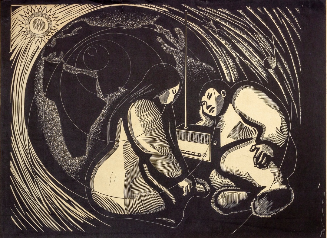 Линогравюру "Слушают мир" Афанасий Мунхалов создал в 1965 году, когда работал преподавателем в Якутском художественном училище.