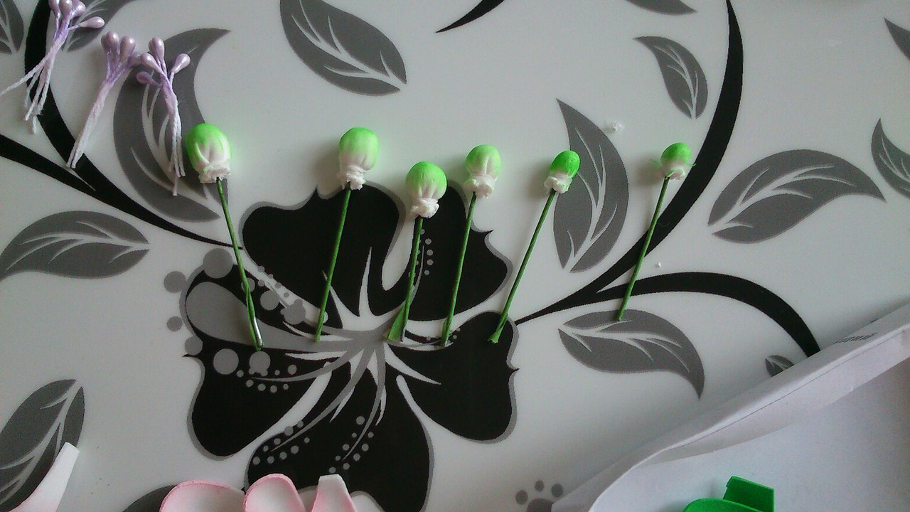 ППомимо открытых бутонов,будут еще закрытые. Для этого беремпроволоку и фольгу. На конце проволоки загибается петельку, приклеивать на супер клей или на горячий пистолет шарик из фольги