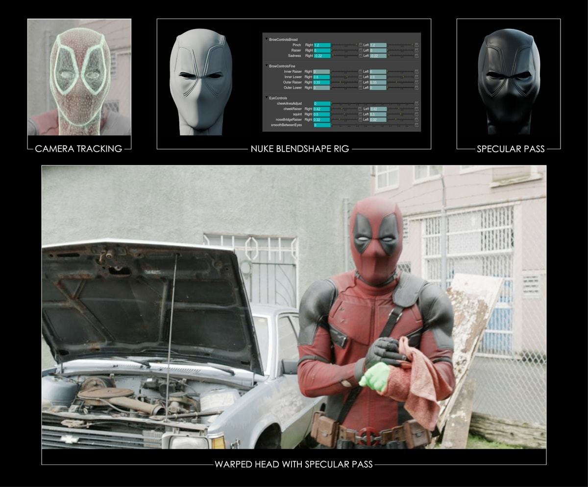 По сути Weta Digital полагалась на метод, разработанный композитинг супервайзером Беном Морганом, заключающимся в отслеживании движения головы Дедпула и деформации головы при помощи редактирования бленд шейпов трехмерной геометрии.
