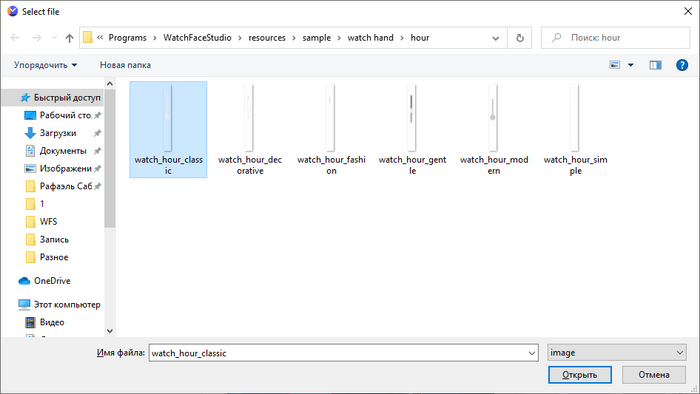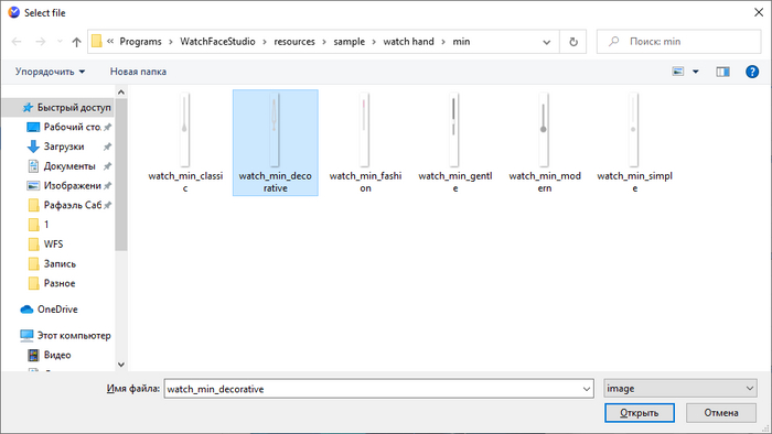 Вы можете выбрать другой файл, он должен быть в формате png, с разрешением 96 пикселей на дюйм (это требование было для старых часов). Выбираем первую стрелку.