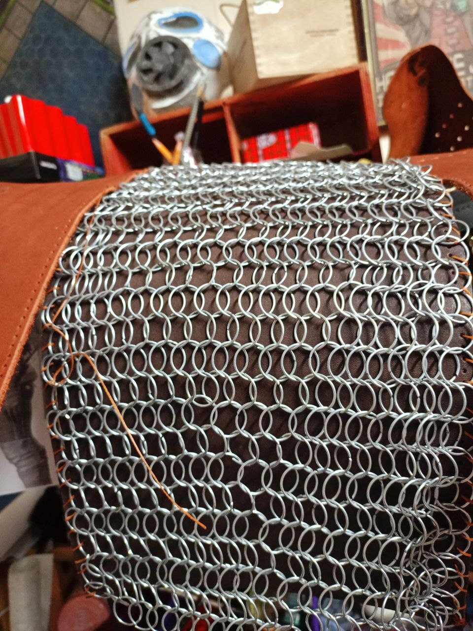 Потом вымеряем кожу, проделываем разные манипуляции .Иногда попадаем себе по пальцу молотком ,а как без этого .Соединяем ,сшиваем, при необходимости пересобираем ,добиваемся идеального результата и продолжаем сбор .Приближаясь к нужной форме.