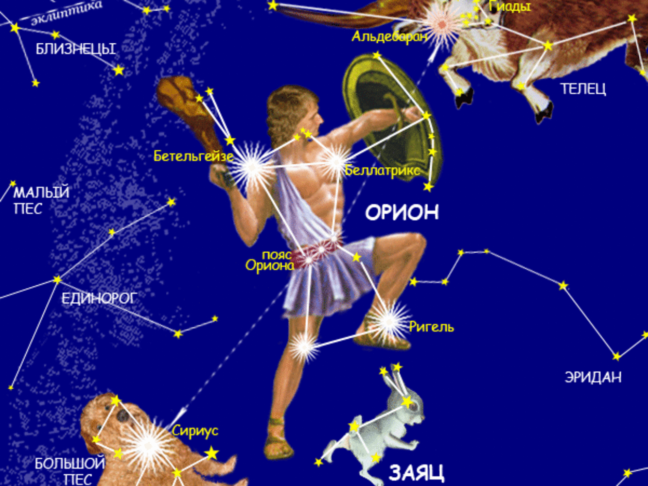 Мифология так рассказывает о легендарном охотнике Орионе. Это был стройный, красивый и ловкий человек. Со своими двумя собаками (Большой Пёс и Малый Пёс) ходил он охотиться по лесам и горам на диких зверей, но сердце у него было добрым.