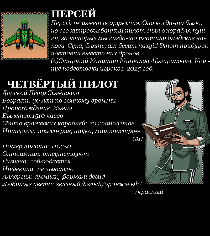 Вот здесь, под первым постом, спросили про поней. Сейчас я думаю над следующими видами двух пилотов (М/Ж), но не могу придумать, как они будут выглядеть. Хочется инопланетян, но образ в голову не идёт. Так что, пока думаю над следующими видами и к какой планете их привязать, хочу обратиться к броням за их ОС'ами. WheatyTail отдаёт мне в проект женского персонажа, поэтому мне нужен ещё один персонаж, но уже мужского пола. Также, WheatyTail, дай инфу по шаблонам из предоставленной информации (что делает корабль пилота, какие цвета корабля и информацию, которую я пишу для пилотов ( возраст, происхождение, вылетов и так далее )).