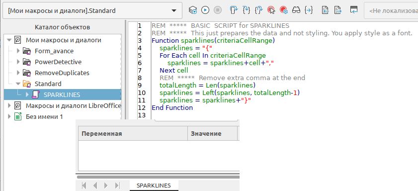 Открываем LibreOffice Calc, нажимаем "Сервис" >>> "Макросы" >>>"Редактировать макрос" и вставляем код. Вкладку Module1 переименовываем в SPARKLINES. Сохраняем.
