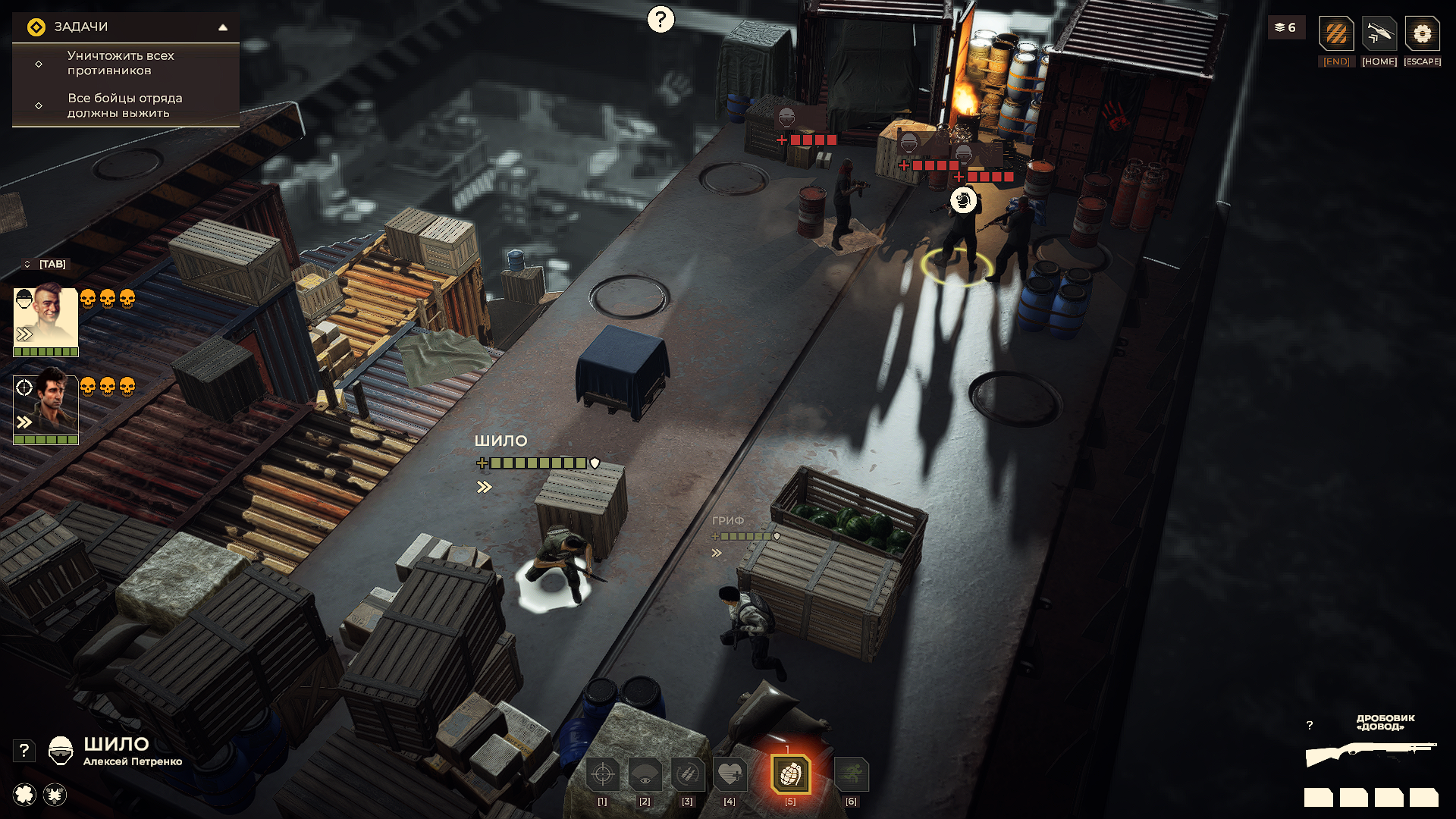 У каждого персонажа есть 2 очка действия, на которые можно походить и пострелять, или далеко походить или дважды пострелять. Кроме того, очко действия можно потратить на уникальные способности персонажа, вроде лечения медика, бросок гранаты, прицеливание снайпера и тд. Еще персонаж может за очко действия перейти в режим наблюдения, взяв на мушку определенную область перед собой – и как только в эту область зайдет противник в момент своего хода – он получит пулю. Так можно прикрывать своих бойцов и ловить врагов на подходах.