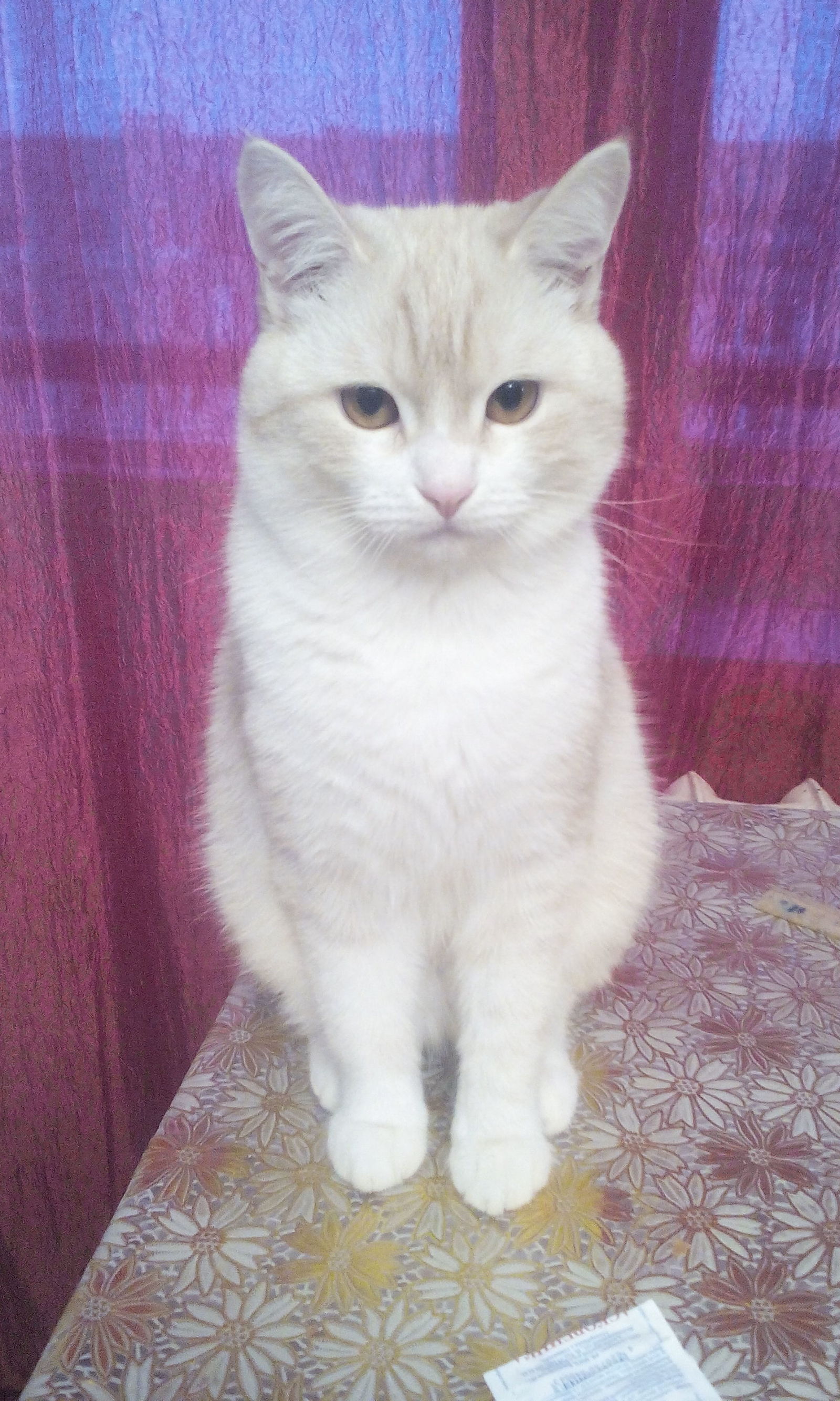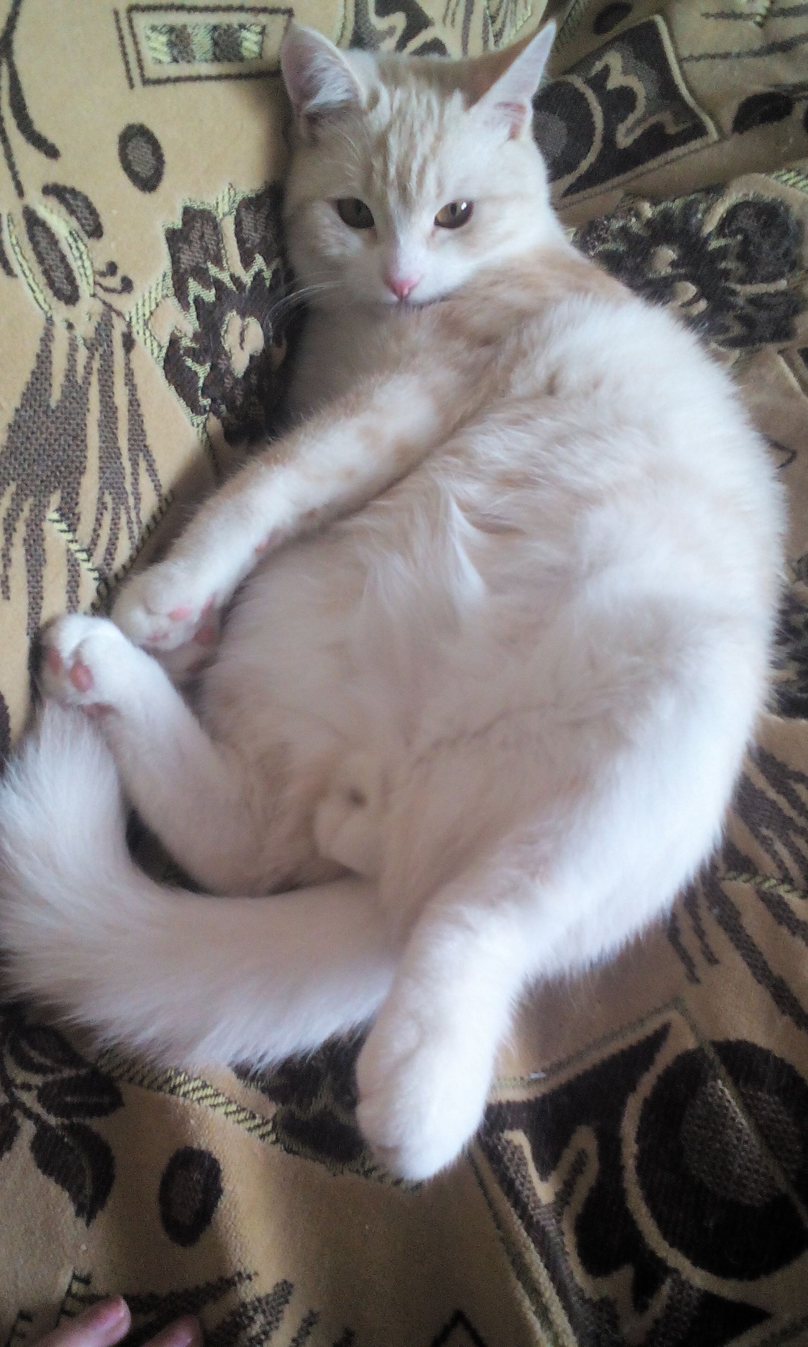 Одним июльским вечером 2015 года приспичило мне сходить в магазин. Выйдя из подъезда, обратила внимание,что под кустом сирени что-то белеет. До сих пор не пойму,что заставило меня тогда обратить на это внимание. Подойдя поближе,увидела ,что под деревом лежит маленький грязный комочек. Человек я сентиментальный да и животных люблю, решила забрать животинку домой,помыть-проглистогонить его и пристроить в добрые руки.Пока я отлучилась ему за едой,котенок залез на диван и начал облизываться.