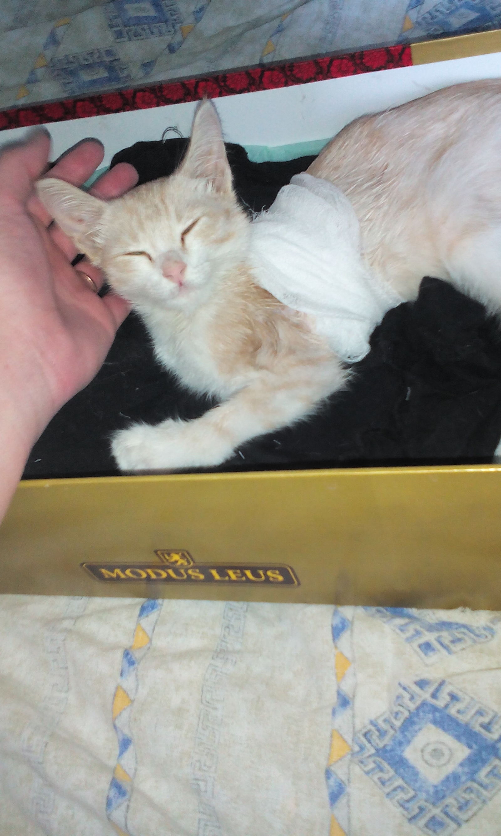 ..но все оказалось не так просто,как я предполагала. По котенку стадом прыгали блохи( я такого количества в жизни не видела),все уши были черные от ушлых клещей.кожа искусана до крови. Животное было очень истощено,на ногах стоял плохо,постоянно заваливаясь на бок и падая. Помыла,выбрала блох как могла, обработала и оставила отдыхать и набираться сил. Назвала Яшей.